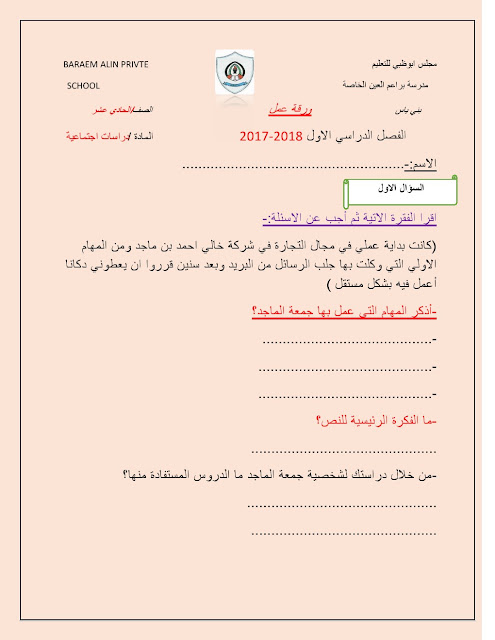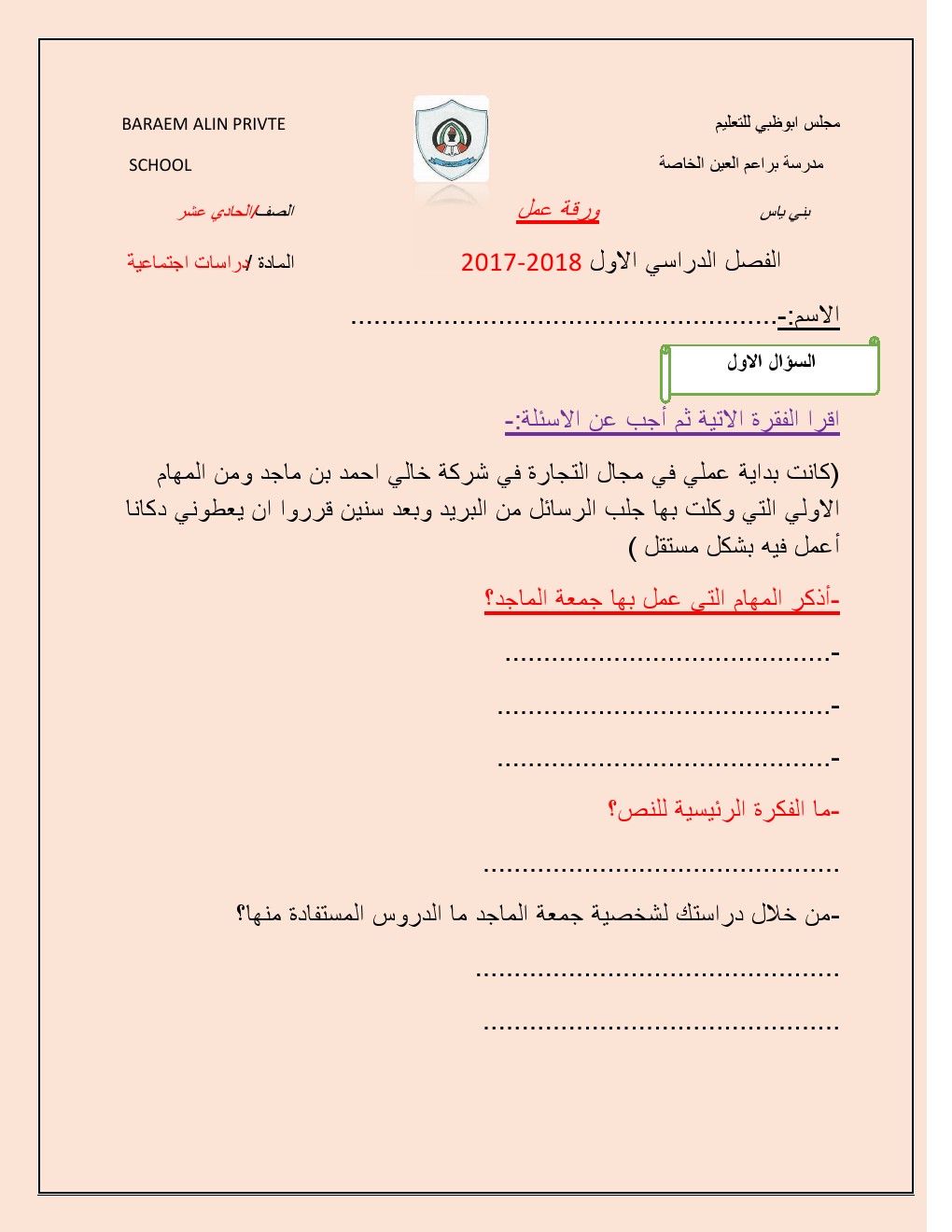 الصف الحادي عشر , الفصل الأول, اجتماعيات , 2017-2018, ورقة عمل رقم (1)