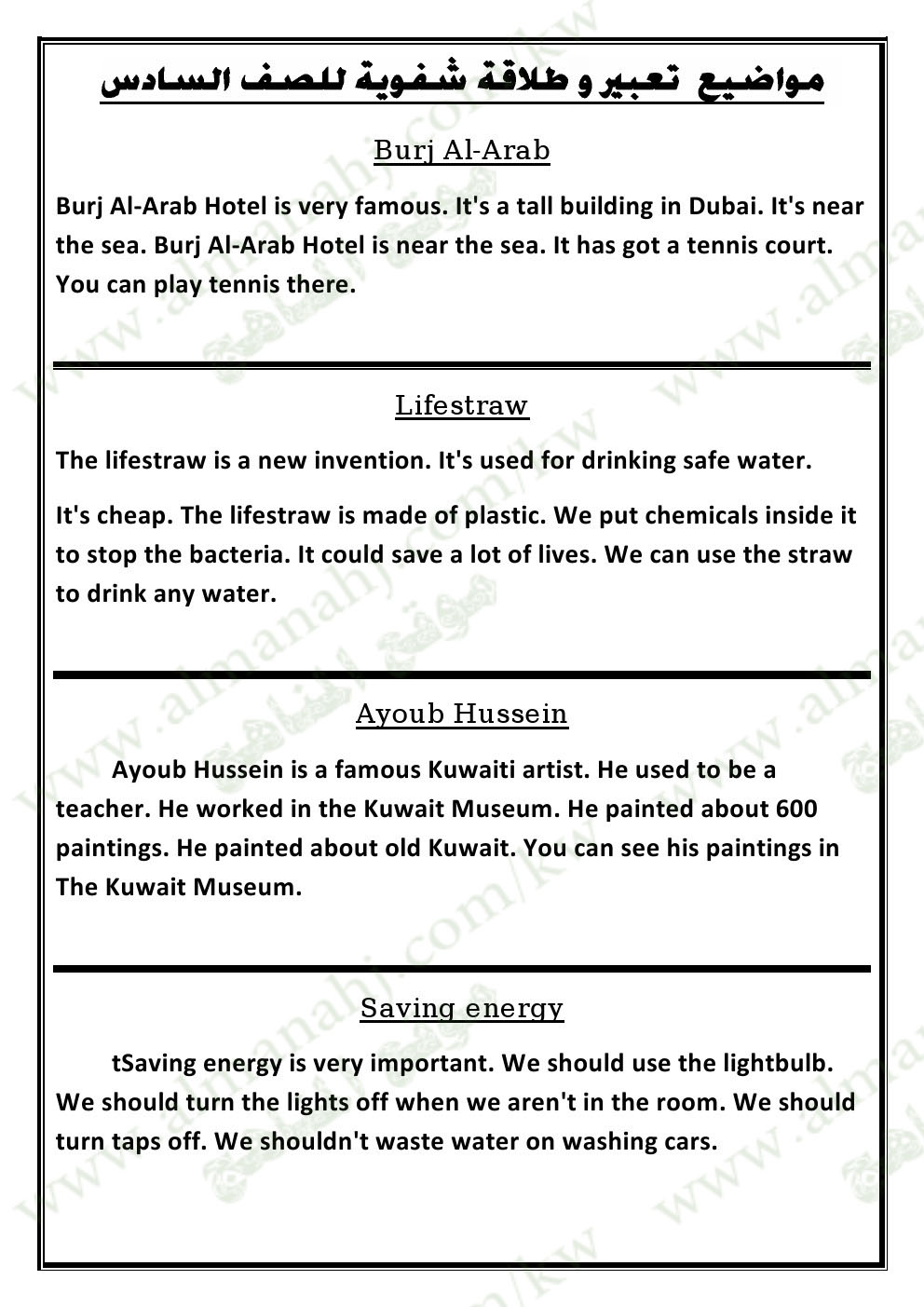 الصف السادس , لغة انكليزية, الفصل الأول, 2017-2018, مواضيع تعبير وطلاقة شفوية
