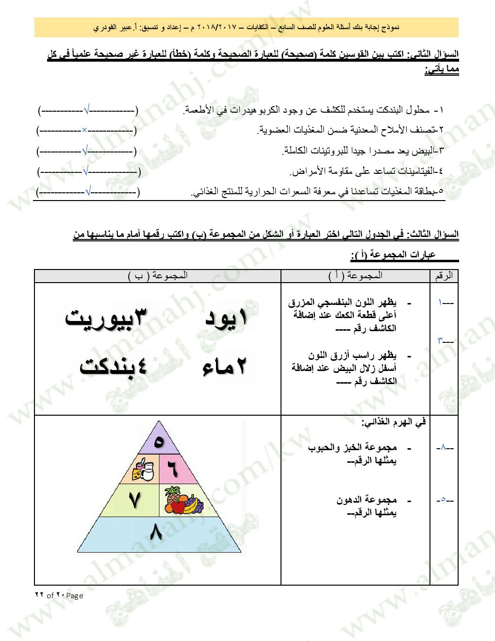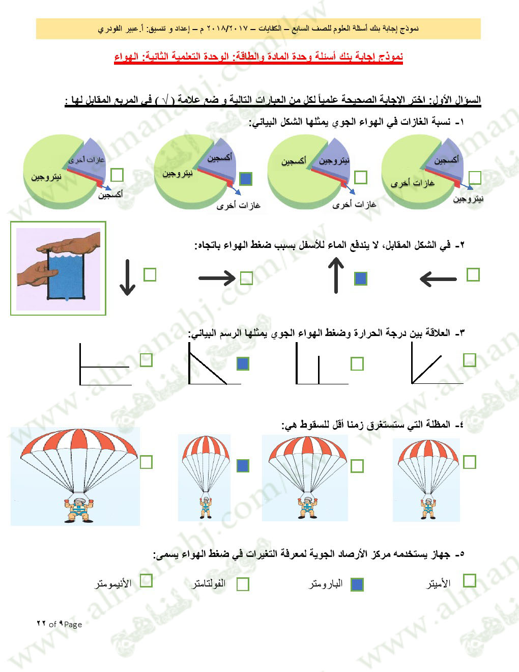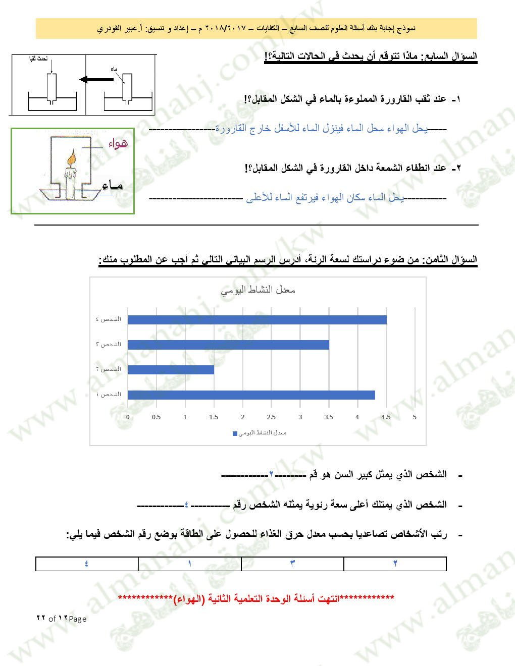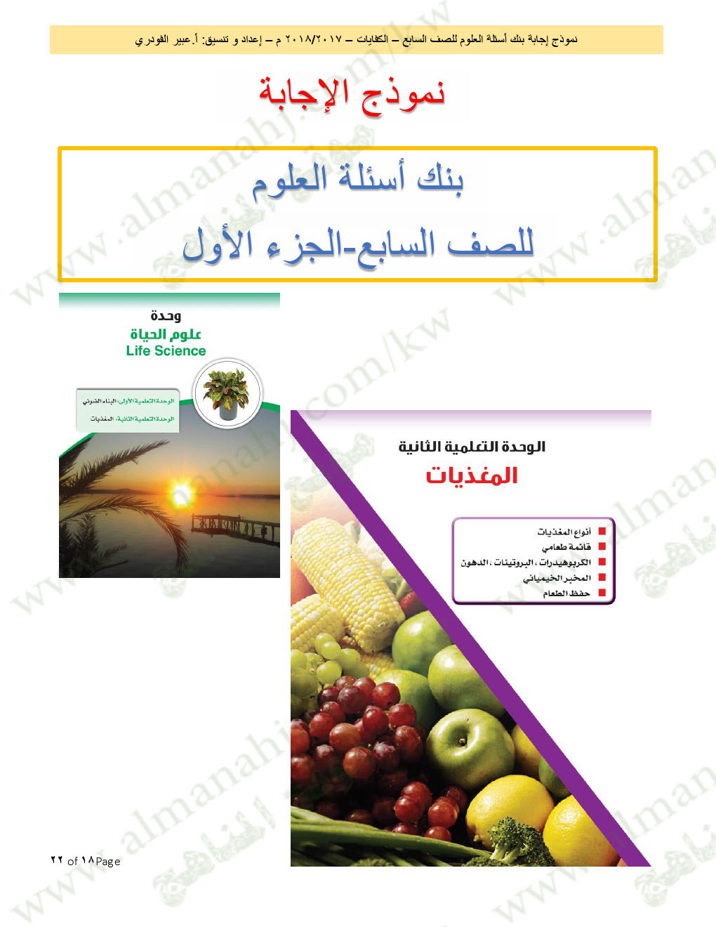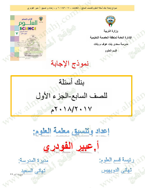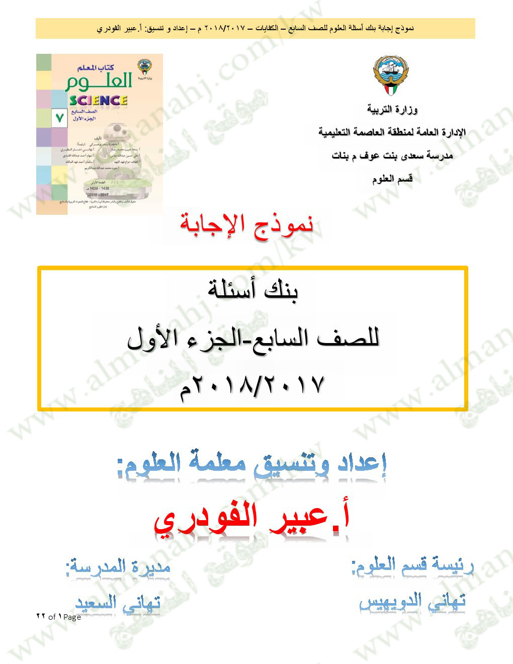معلومات الملف: الصف السابع, علوم, الفصل الأول, 2017-2018,نموذجإجابة بنك أسئلة العلوم -الكفايات | ||