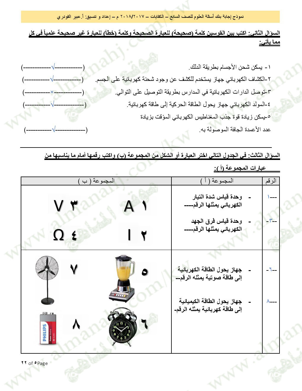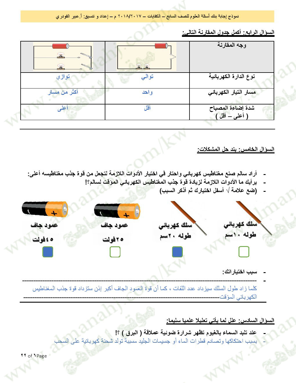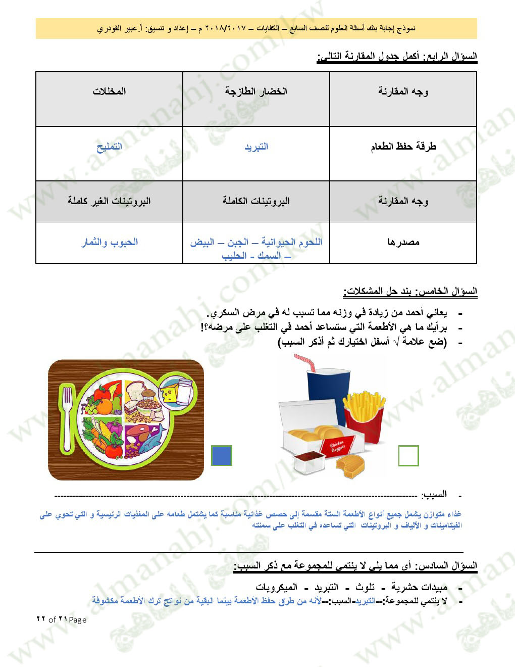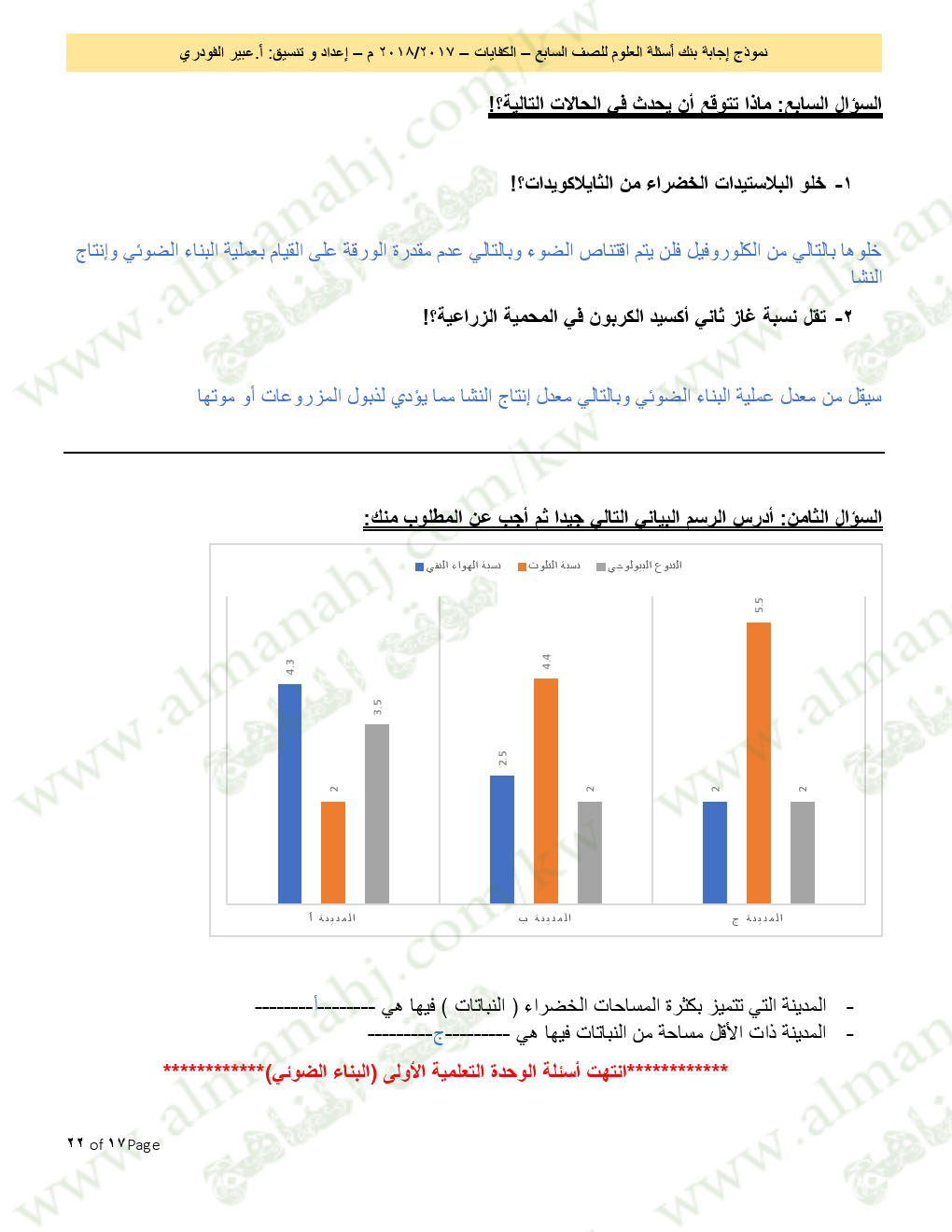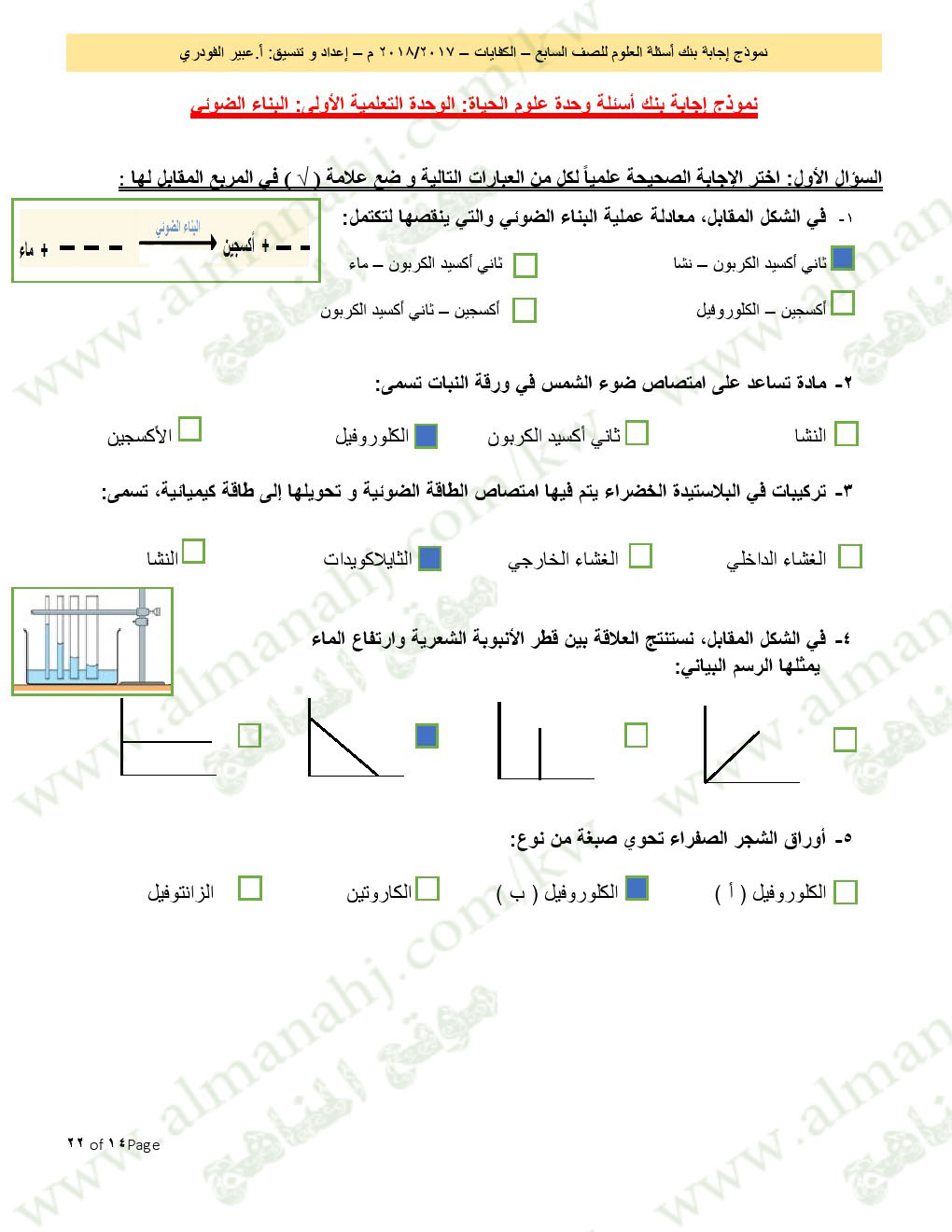 معلومات الملف: الصف السابع, علوم, الفصل الأول, 2017-2018,نموذجإجابة بنك أسئلة العلوم -الكفايات | ||