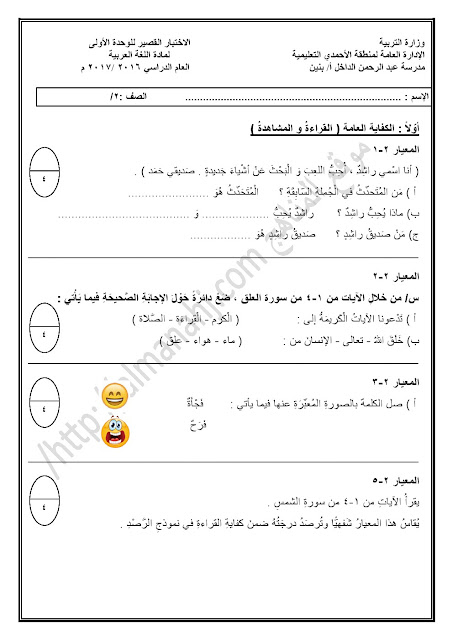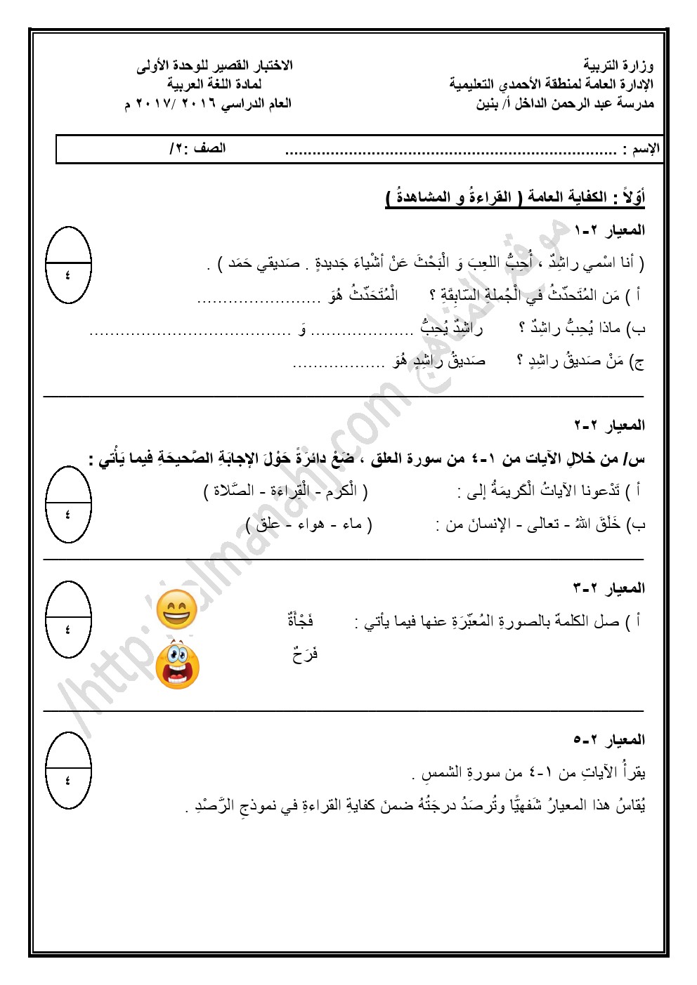 معلومات الملف: الصف الثاني, لغة عربية, الفصل الأول, 2017-2018, منهج الكفايات, الوحدة الأولى, اختبار قصير | |||
