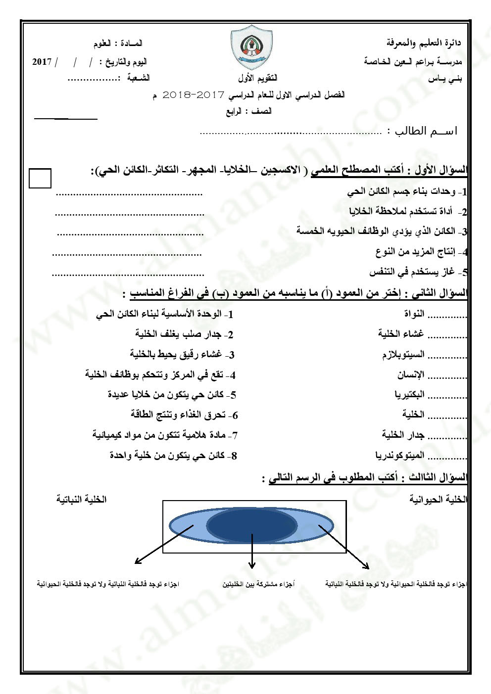 معلومات الملف: الصف الرابع, الفصل الأول, علوم, 2017-2018, التقويم الأول ويمكن للطلبة التدرب على هذا النموذج للتحضير للاختبار التكويني | |||