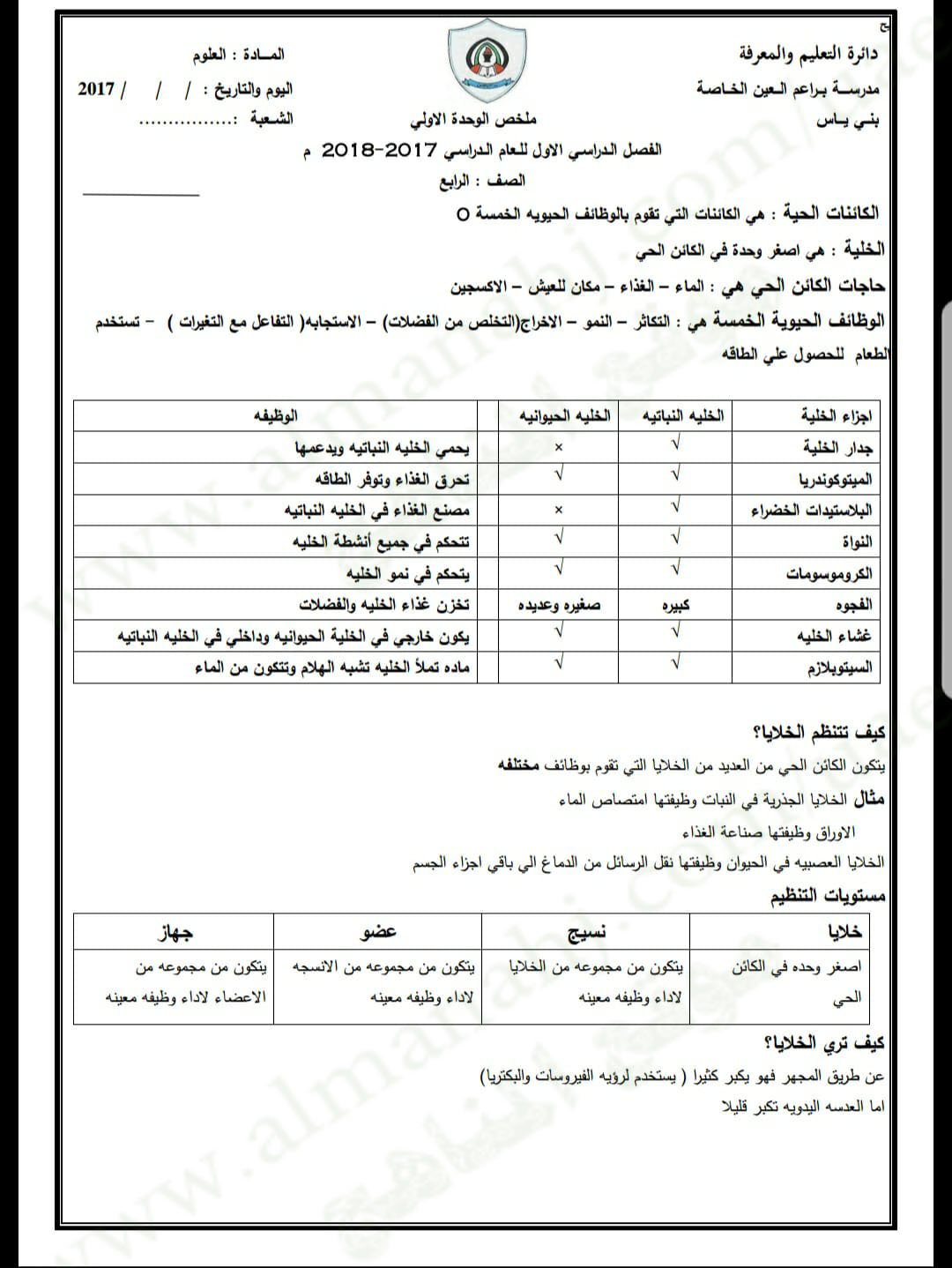 معلومات الملف: الصف الرابع, الفصل الأول, علوم, 2017-2018, الوحدة الثانية, ملخص الدرس الأول | ||