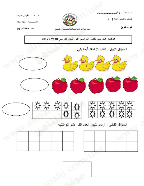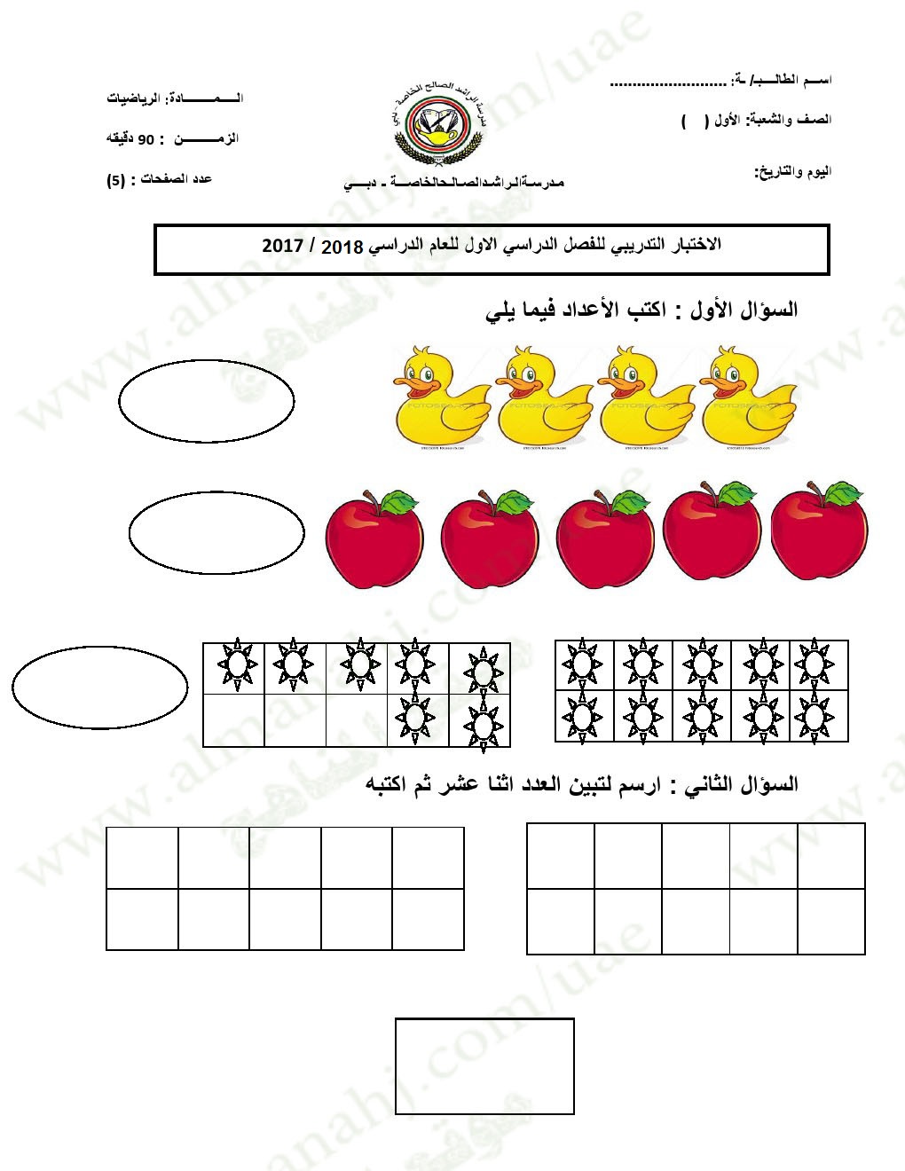 معلومات الملف: الصف الأول, الفصل الأول, رياضيات, 2017-2018, اختبار تدريبي | |||