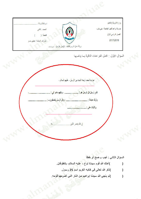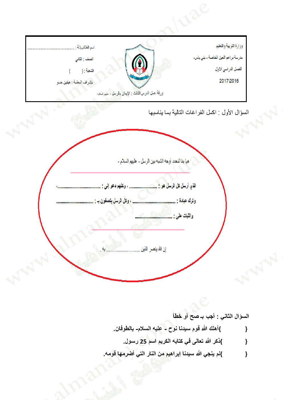 الصف الثاني, الفصل الأول. , تربية اسلامية, 2017-2018, ورقة عمل درس الايمان بالرسل وذلك وفق المنهاج الاماراتي