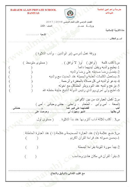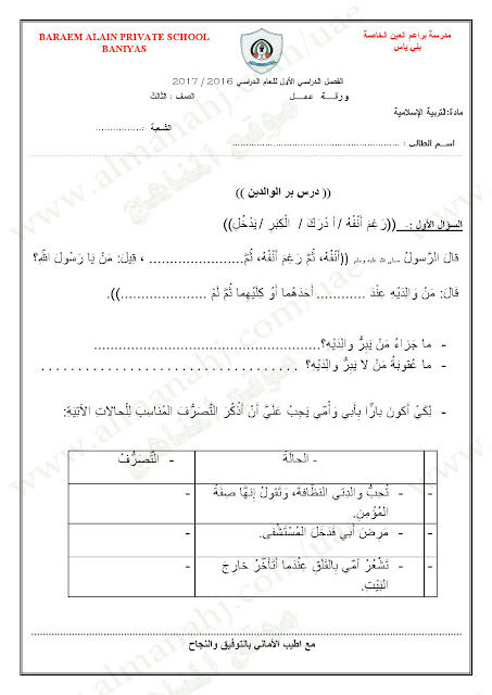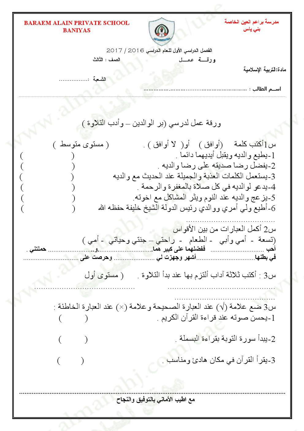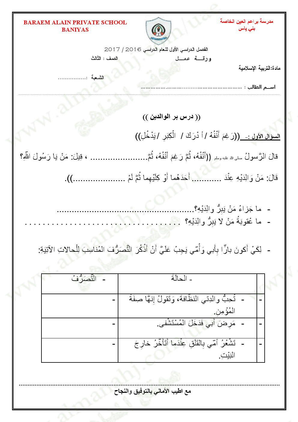 معلومات الملف: الصف الثالث, الفصل الأول, تربية اسلامية, 2017-2018, ورقة عمل درس بر الوالدين | |||