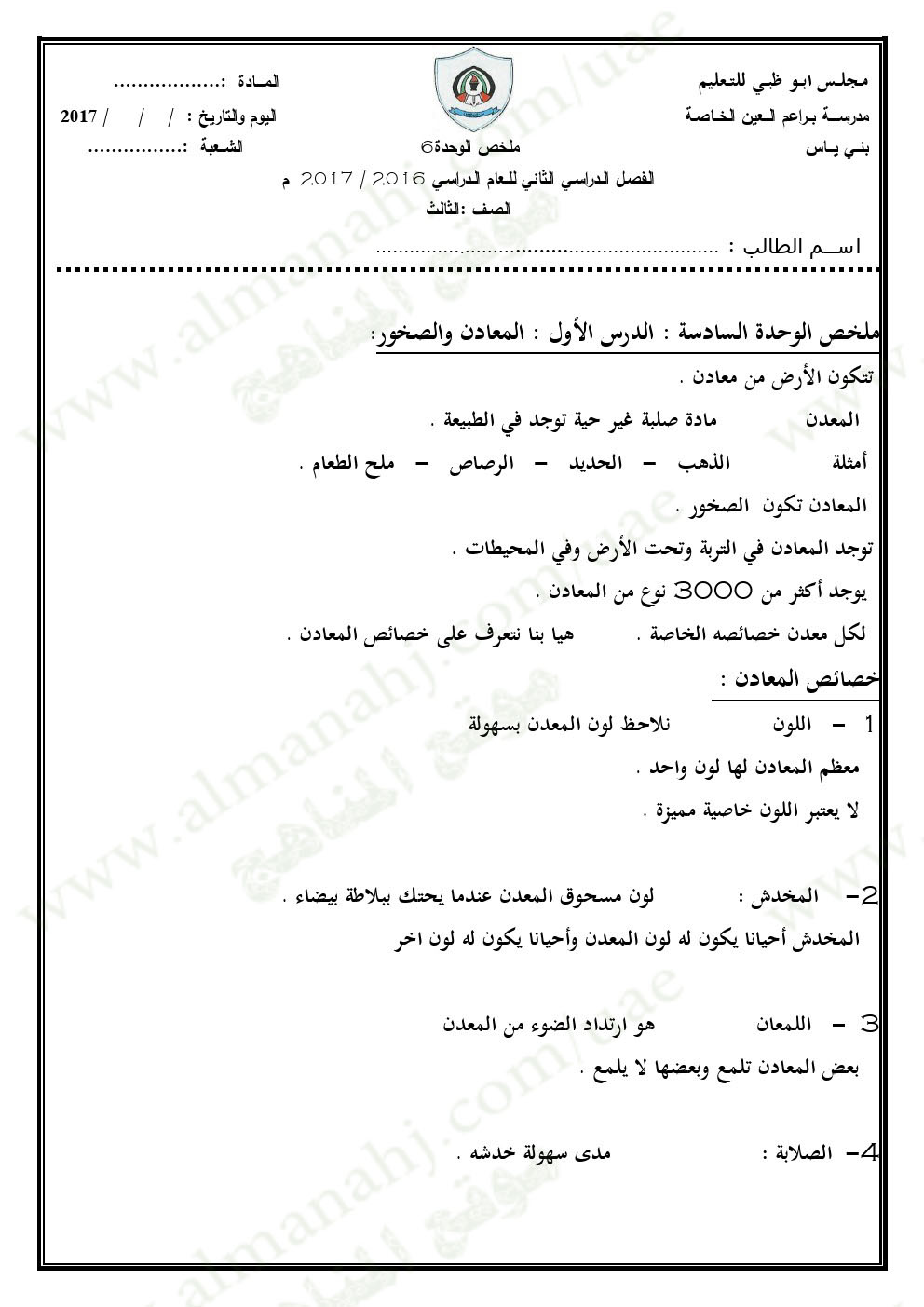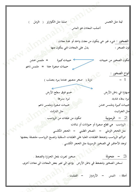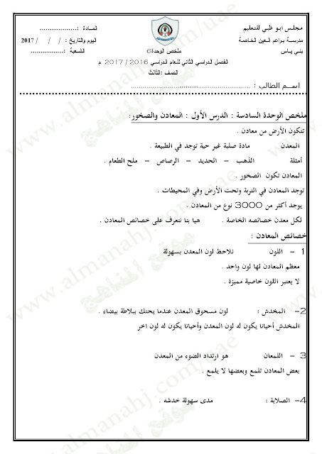 معلومات الملف: الصف الثالث, الفصل الثاني, علوم, 2016-2017, ملخص الوحدة السادسة (المعادن والصخور, التربة, الأحافير والوقود) | |||