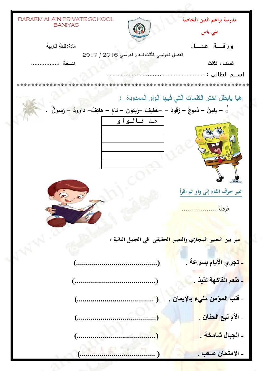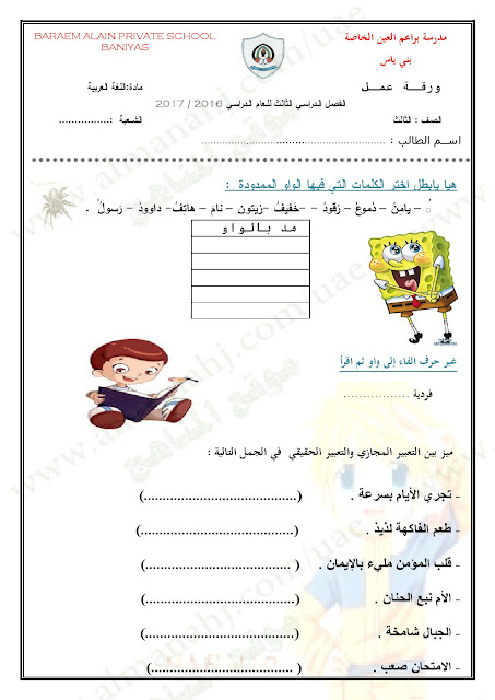 الصف الثالث, الفصل الأول , لغة عربية, 2017-2018, ورقة عمل المد بالواو والتعابير المجازية والحقيقية