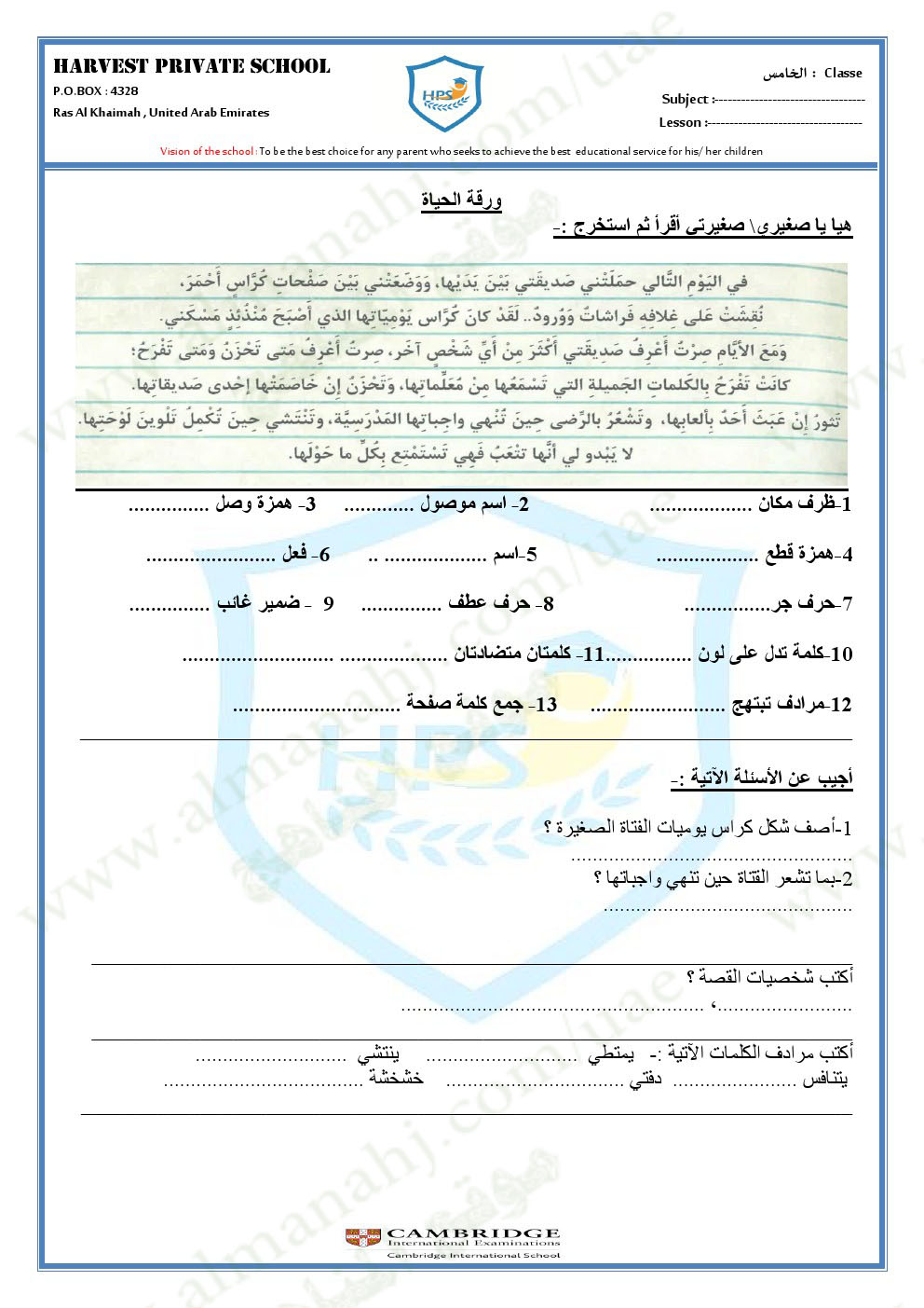 الصف الخامس, الفصل الأول , لغة عربية, 2017-2018, ورقة عمل تدريبية+الحل