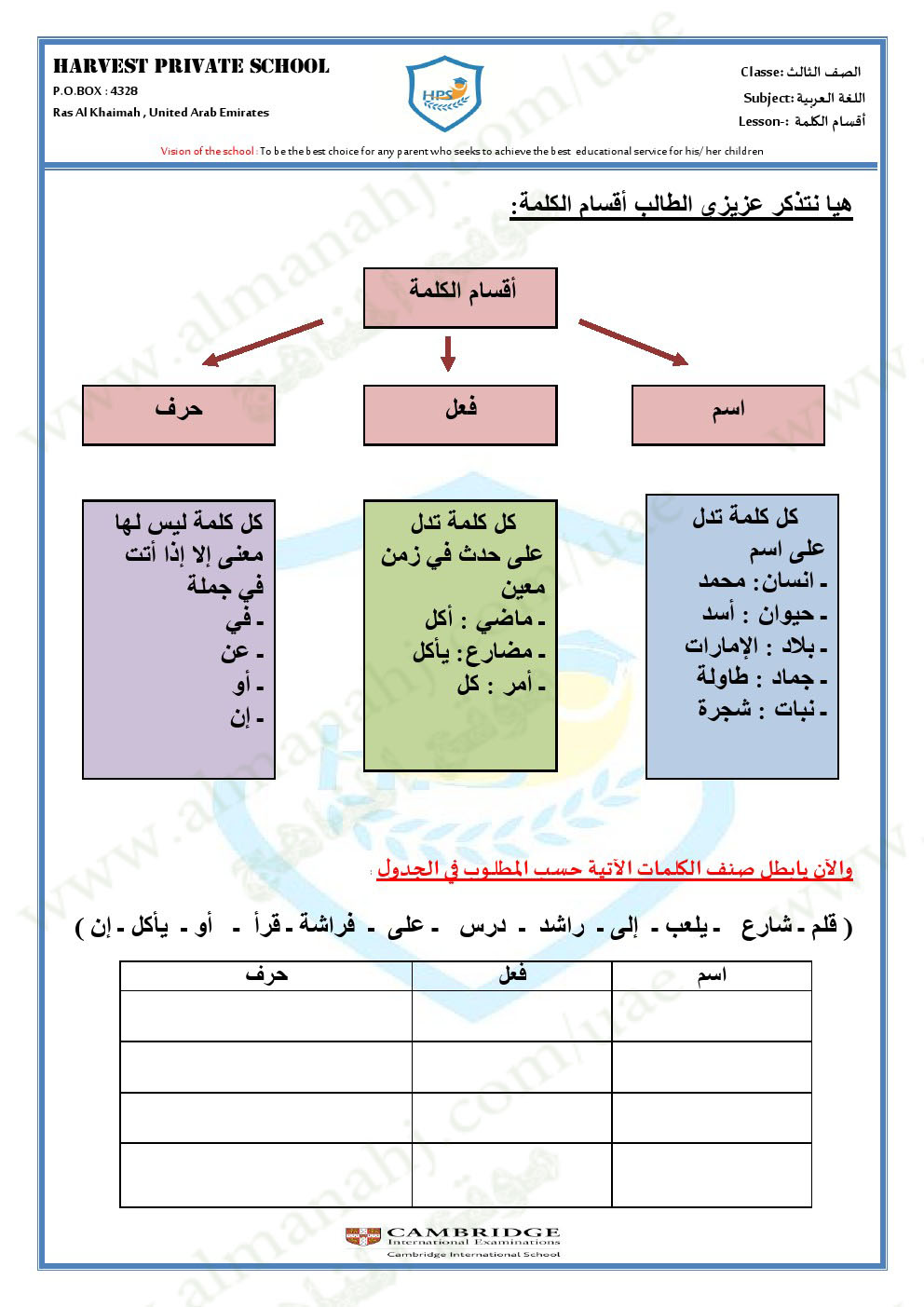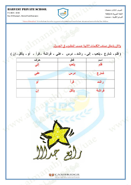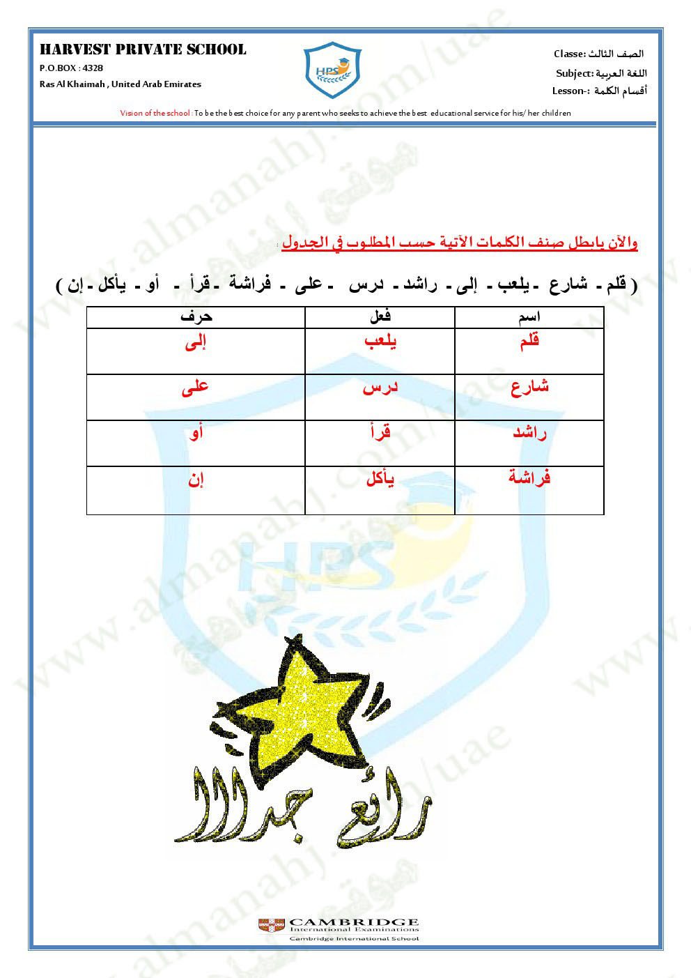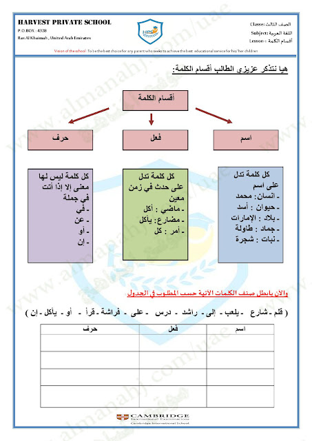 معلومات الملف: الصف الثالث, الفصل الأول, لغة عربية, 2017-2018, ورقة عمل أقسام الكلمة +الحل | |||