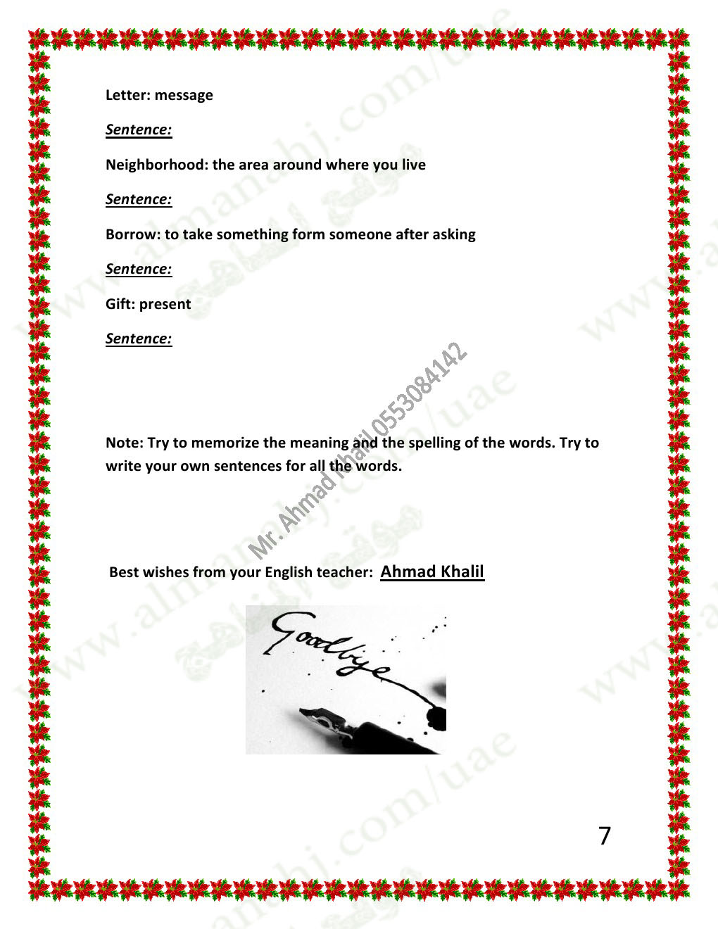 معلومات الملف: الصف السابع, الفصل الأول, لغة انكليزية, 2017-2018, قائمة مفردات الوحدة الأولى | |||
