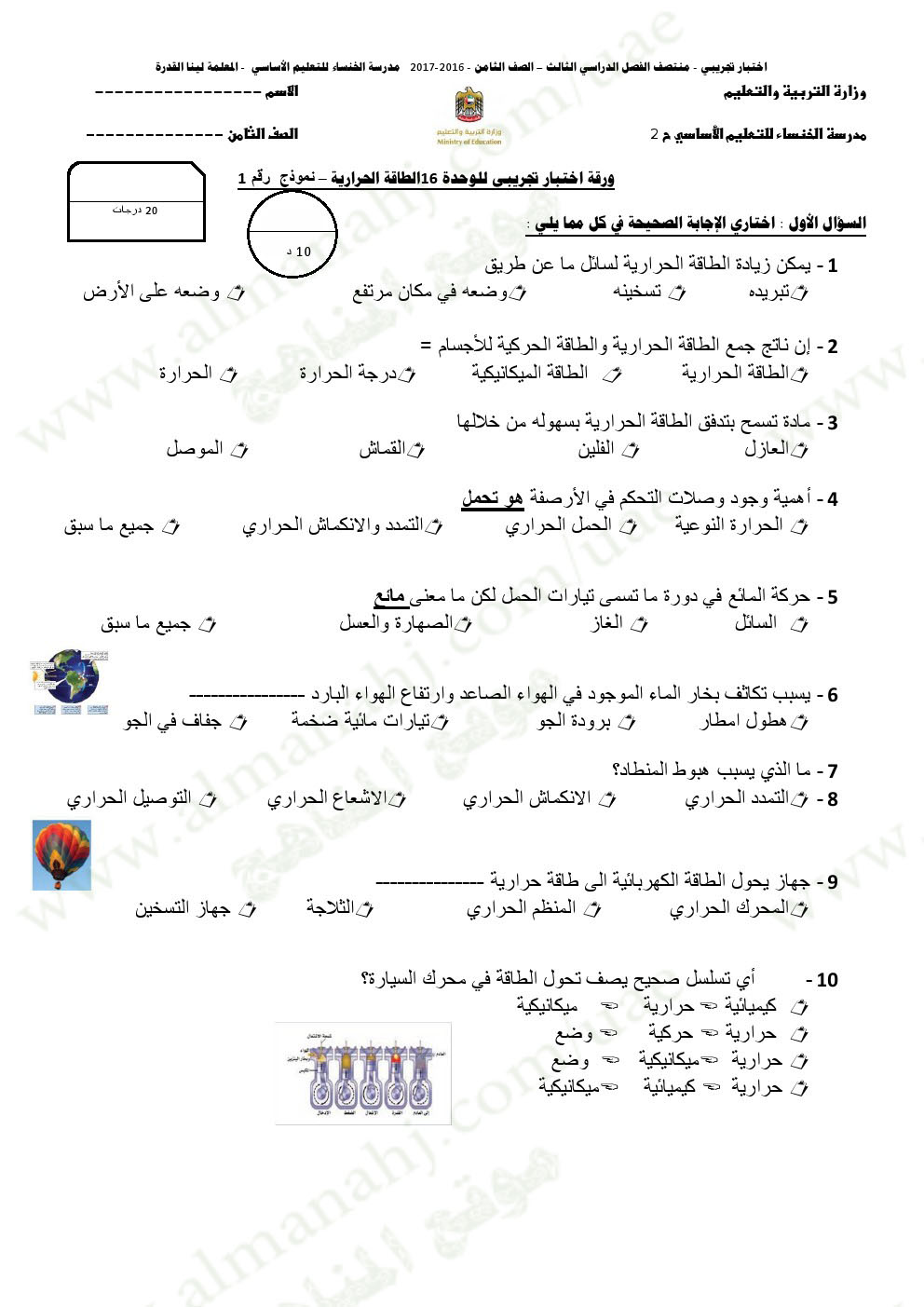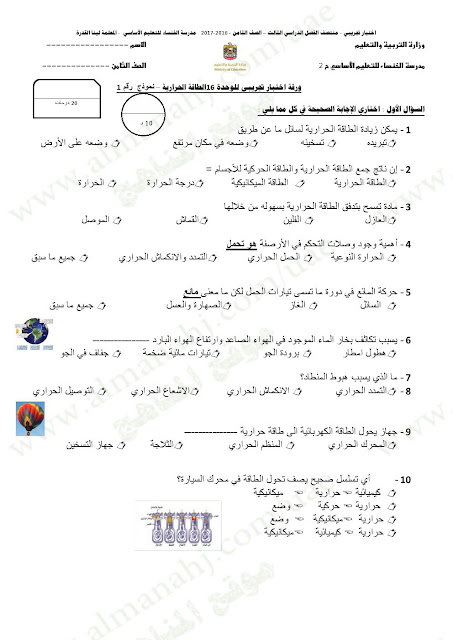 معلومات الملف: الصف التاسع العام, الفصل الأول, علوم, 2017-2018, اختبار تجريبي في الطاقة الحرارية | |||