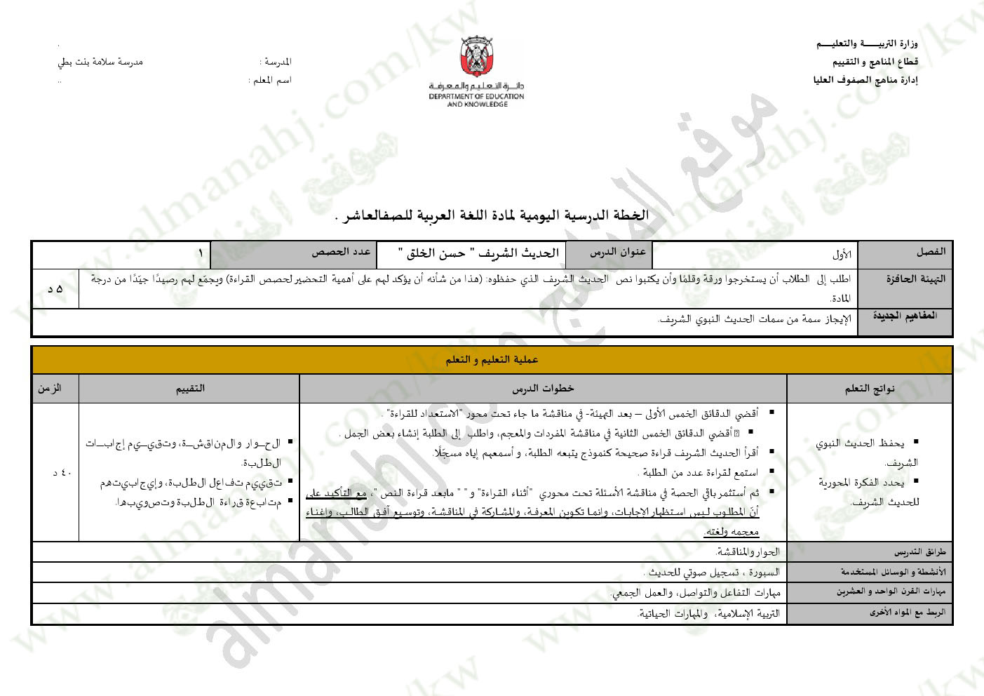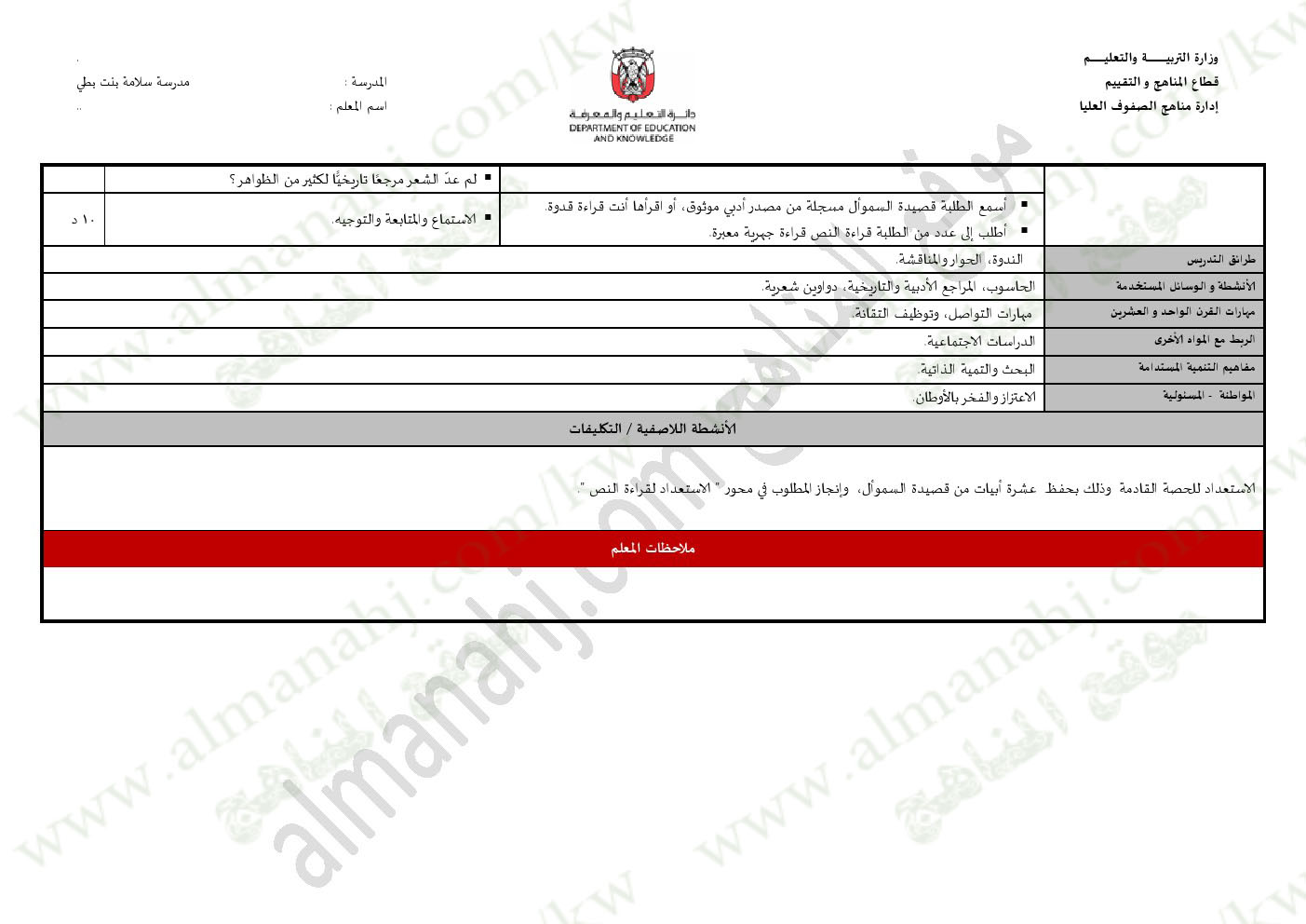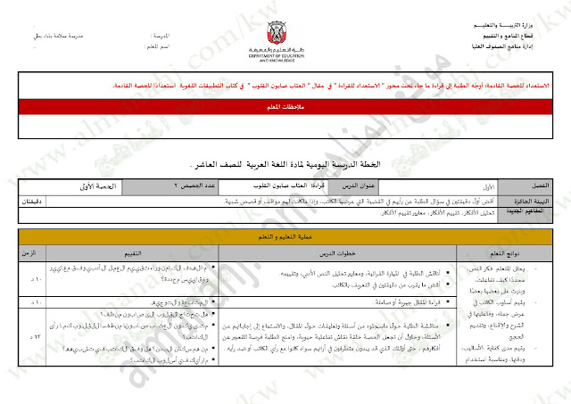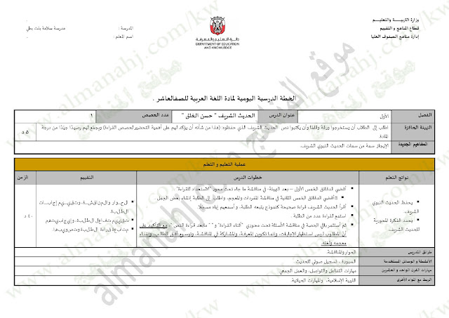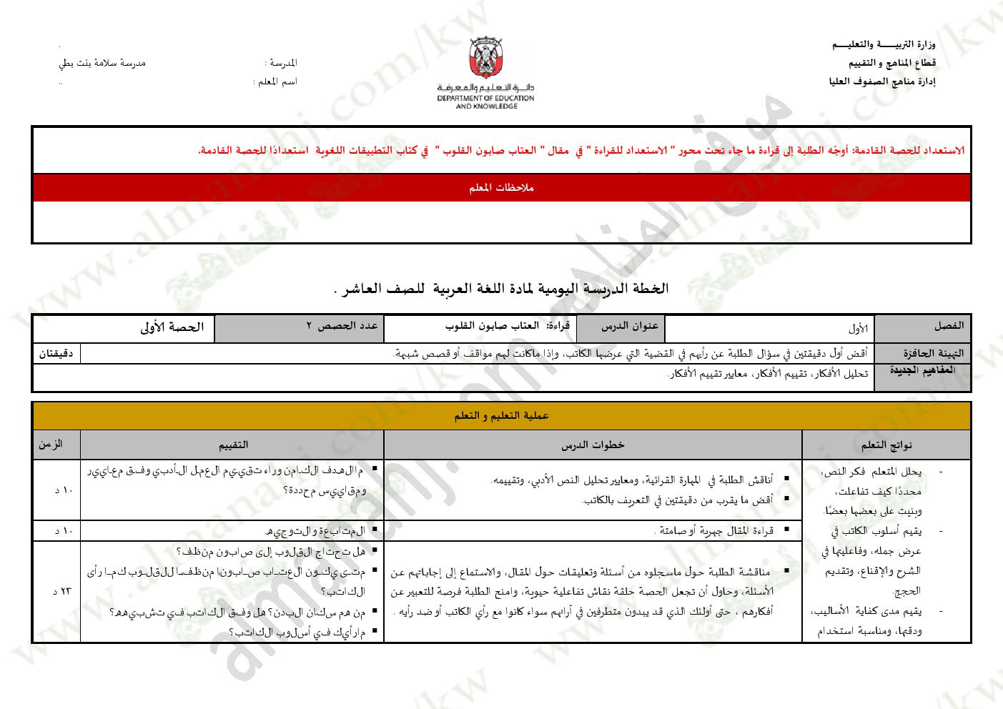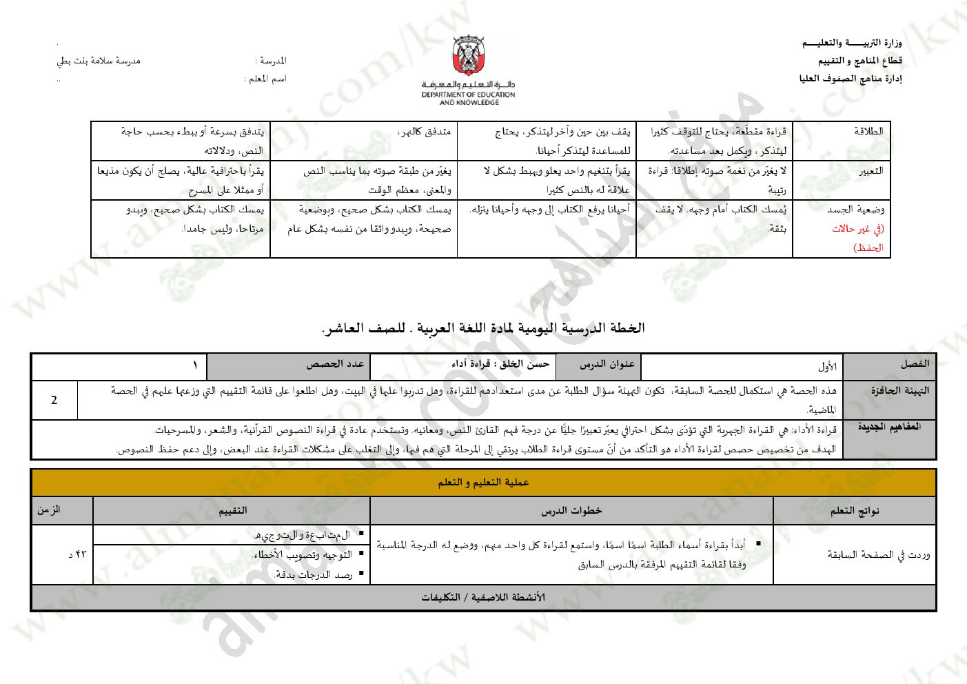 معلومات الملف: الصف العاشر, الفصل الأول, لغة عربية, 2017-2018, الخطة الدرسية اليومية (ملف خاص بالمدرسين) | |||