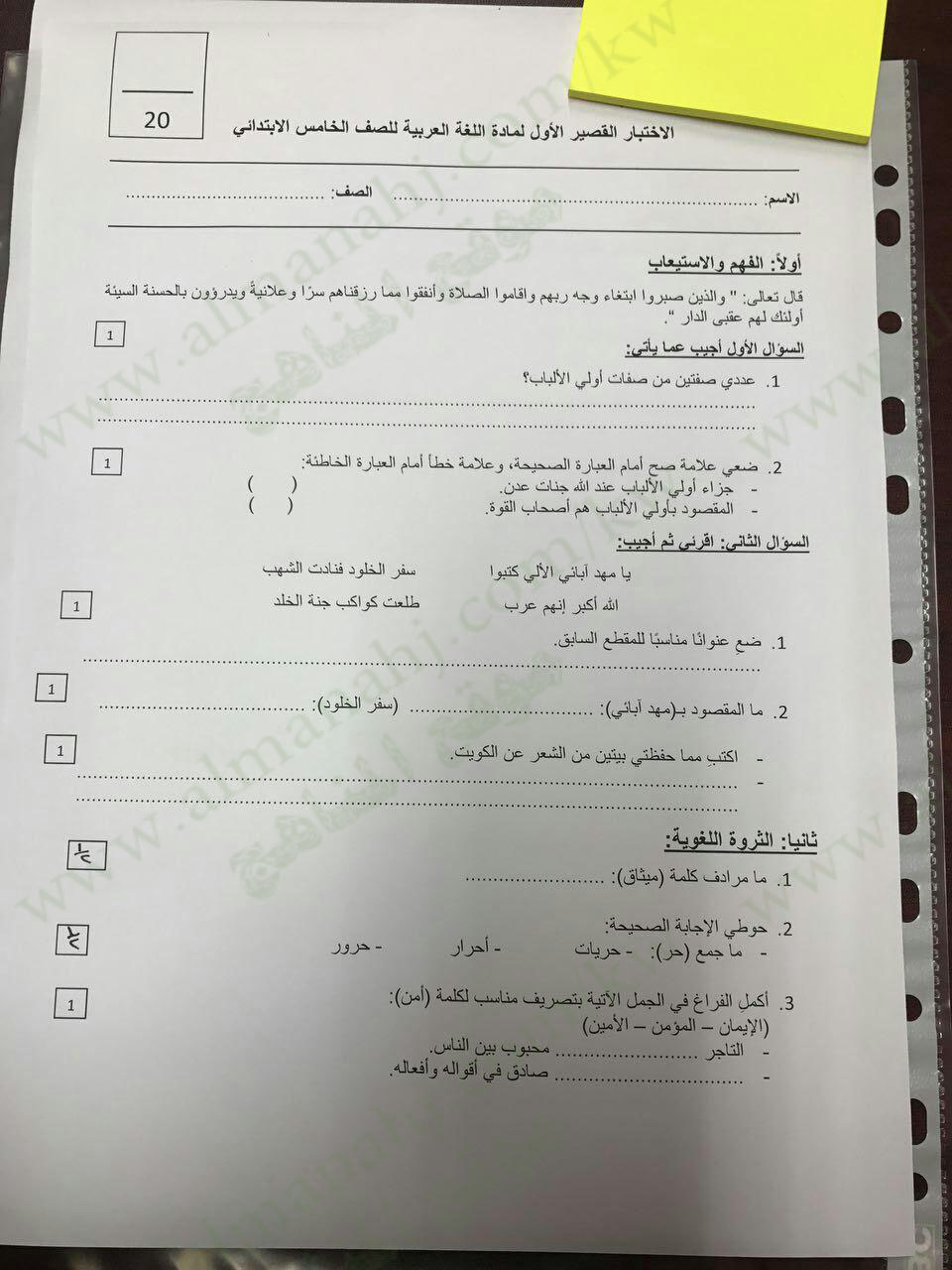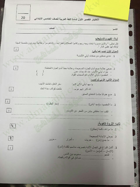 معلومات الملف: الصف الخامس, لغة عربية, الفصل الأول, 2017-2018, الاختبار القصير الأول | |||