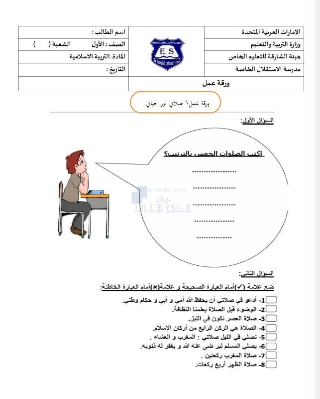 ورقة عمل درس صلاتي نور حياتي - إعداد: مدرسة الاستقلال الخاصة | ||