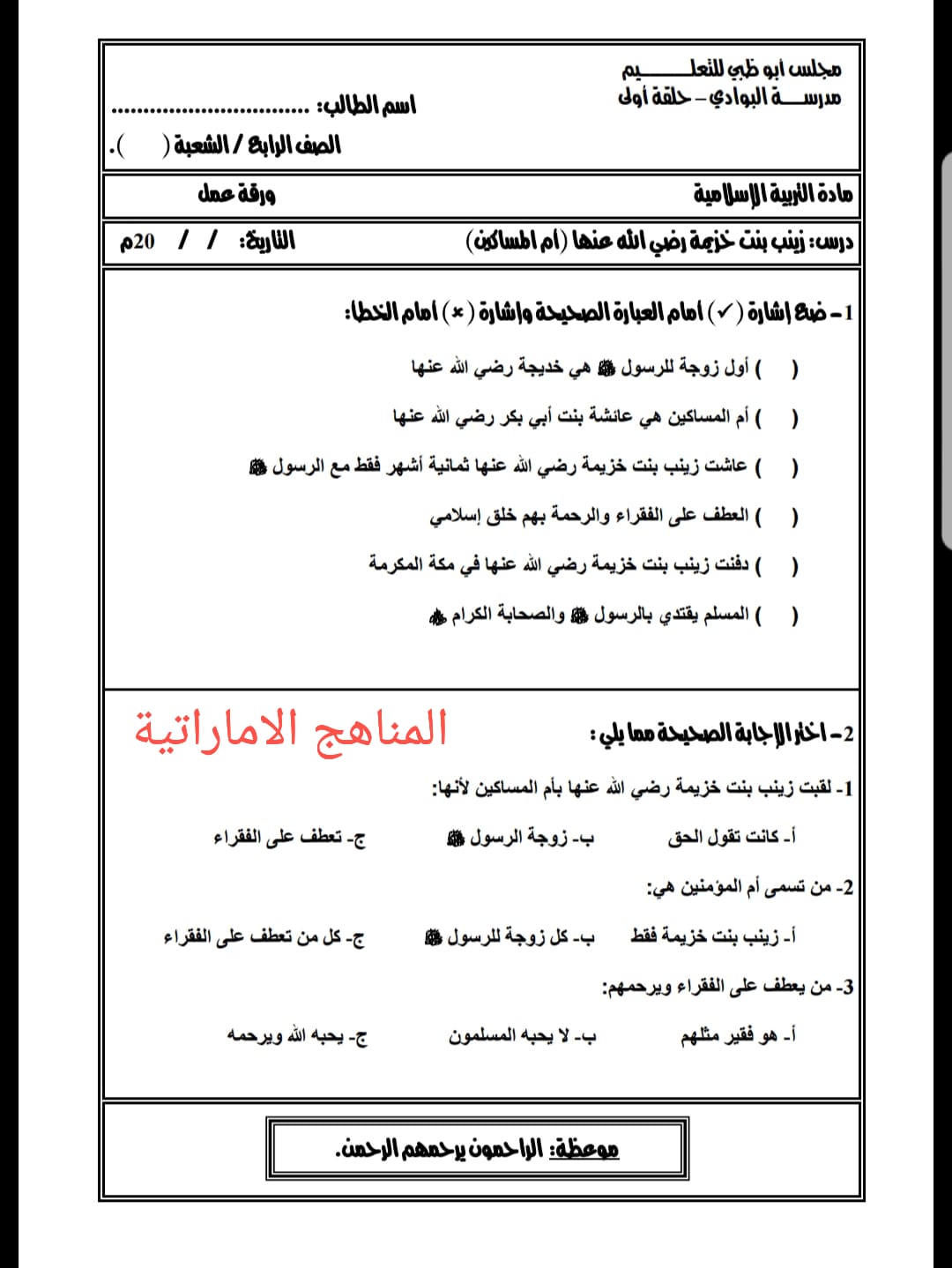 الصف الرابع, الفصل الأول, تربية اسلامية , 2017-2018, ورقة عمل درس (زينب رضي الله عنها)