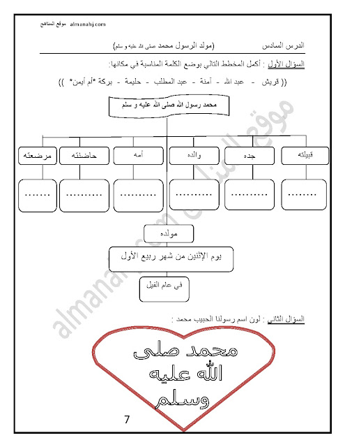 الصف الأول, الفصل الأول, تربية اسلامية, 2017-2018, ورقة عمل درس (مولد الرسول صلى الله عليه وسلم)