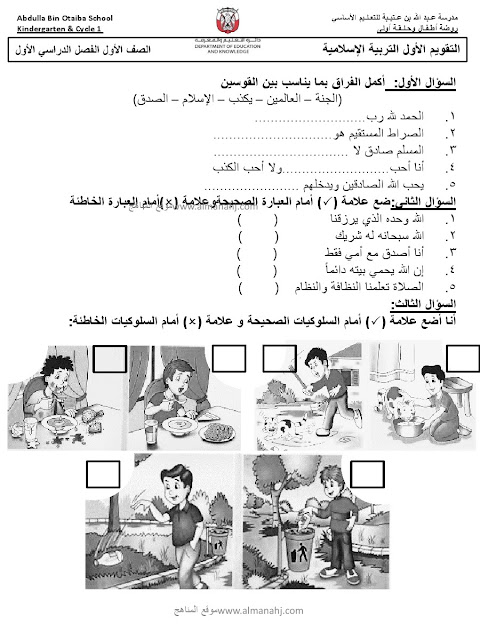 الصف الأول, الفصل الأول, تربية اسلامية , 2017-2018 , التقويم الأول في التربية الاسلامية | ||