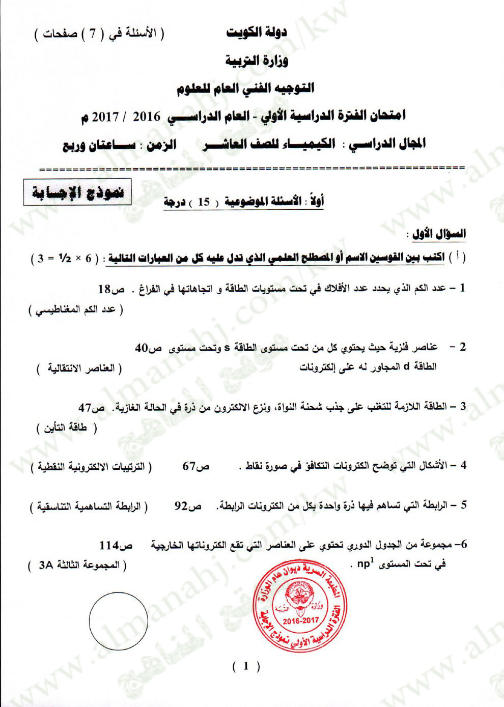 معلومات الملف: الصف الثاني عشر, كيمياء, الفصل الأول, 2017-2018,نموذجإجابة الفترة الأولى للعام الدراسي 2016-2017 | |||