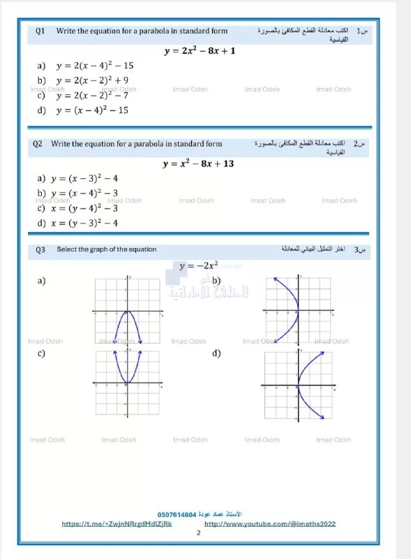 مراجعة الدرس الثاني القطع المكافئ اعتماداً على الاختبارات السابقة من الوحدة السابعة - إعداد: عماد عودة | ||