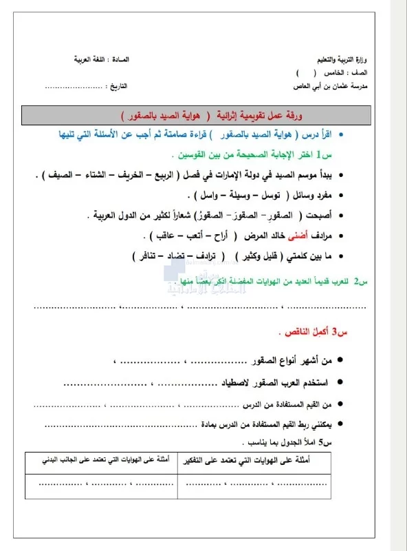 تم إيجاد الملف: ورقة عمل تقويمية إثرائية درس هواية الصيد بالصقور