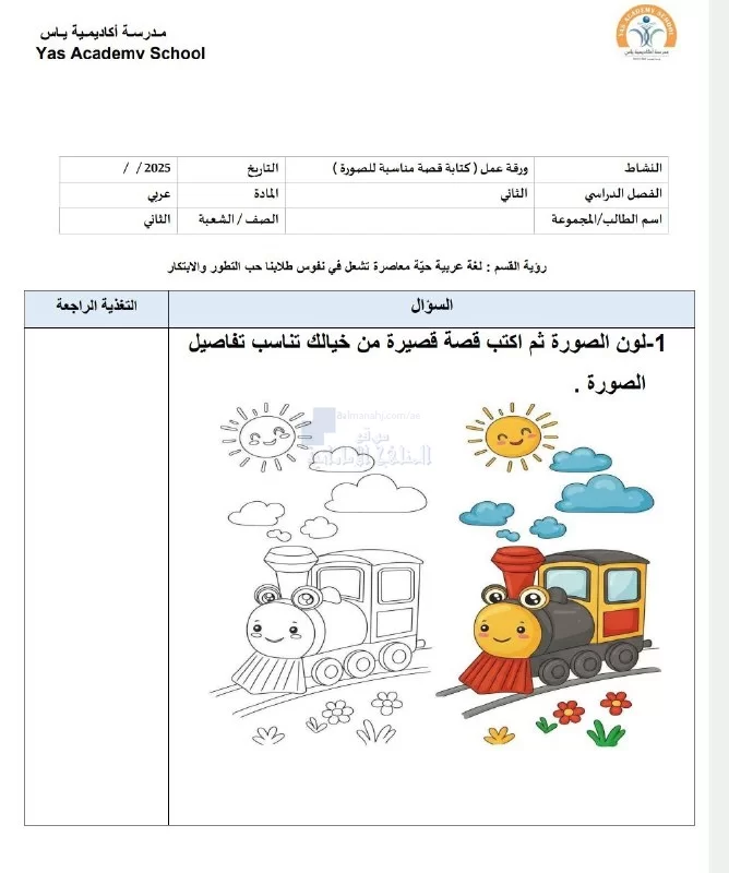 ورقة عمل كتابة قصة مناسبة للصورة - إعداد: مدرسة أكاديمية ياس | ||