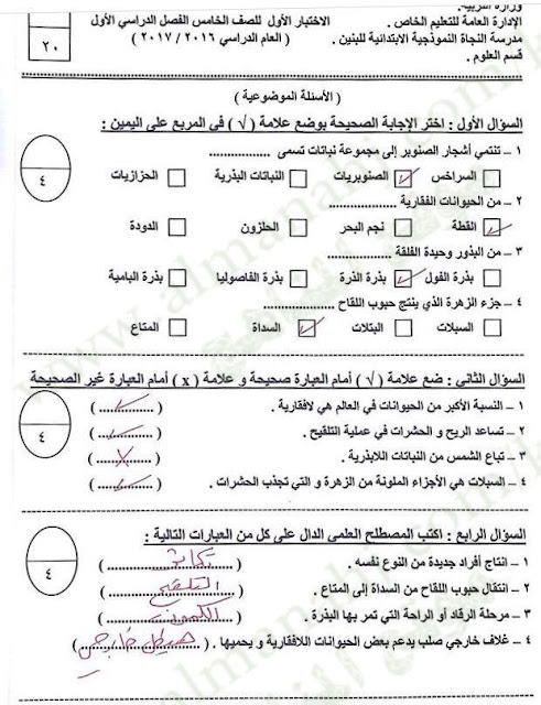 معلومات الملف: الصف الخامس, علوم, الفصل الأول, 2017-2018, اختبار قصير | |||