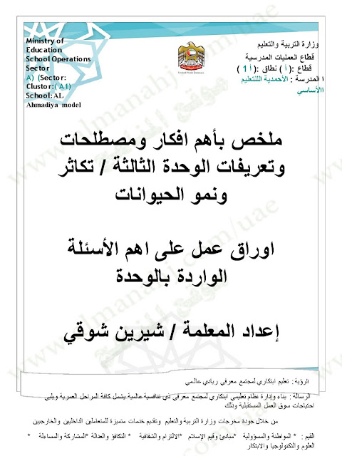 معلومات الملف: الصف الرابع, الفصل الأول, علوم, 2017-2018, ملخص و أوراق عمل الوحدة الثالثة (تكاقر الحيوانات ونموها) | |||