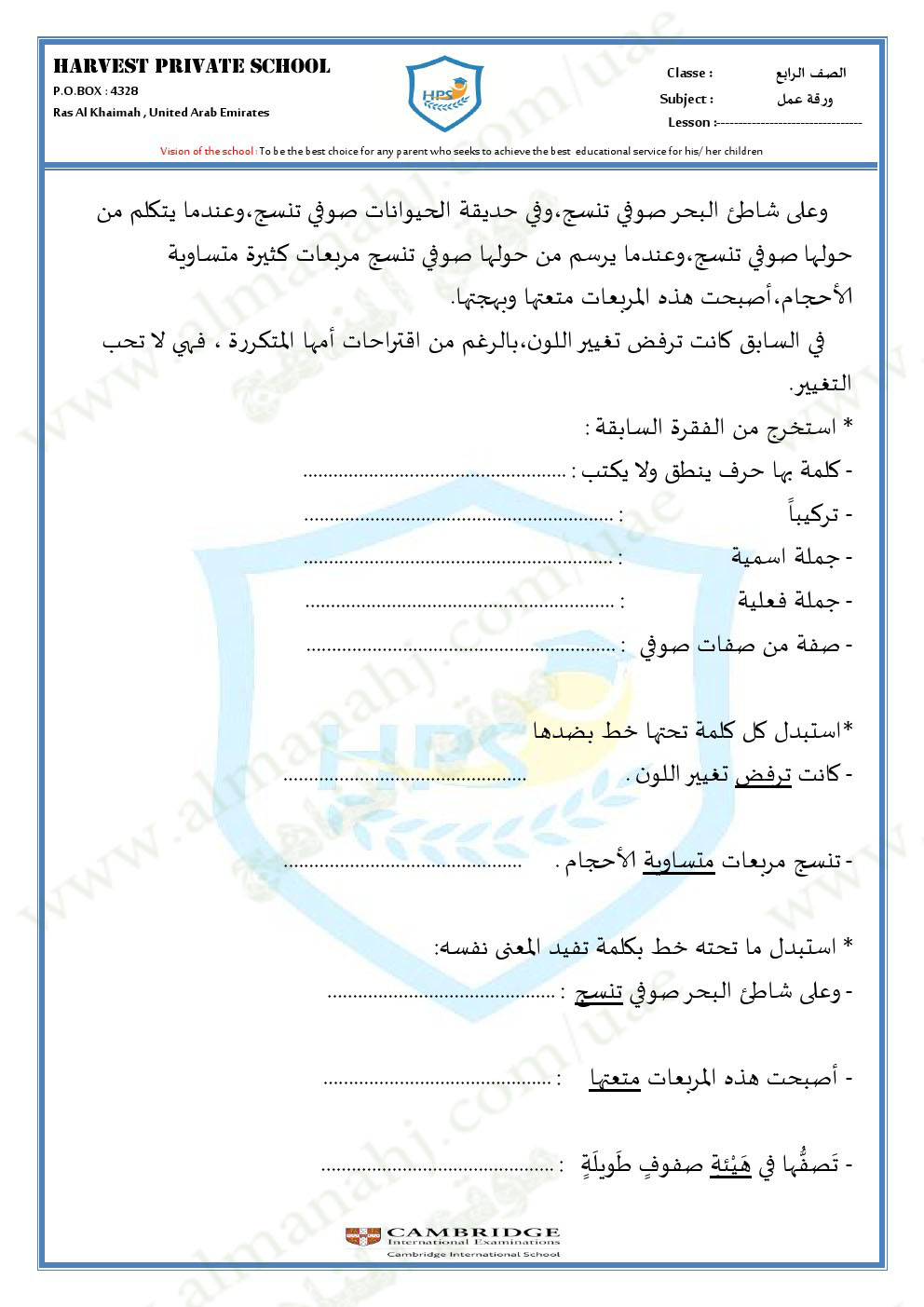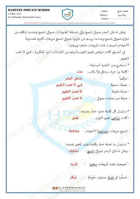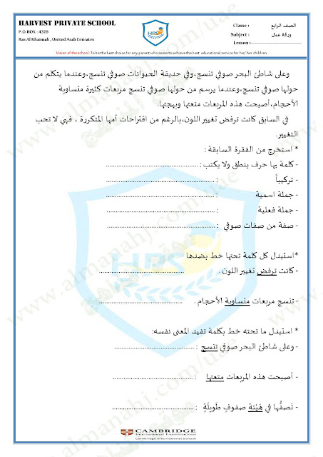 الصف الرابع, الفصل الأول, لغة عربية, 2017-2018, ورقة عمل نموذجية