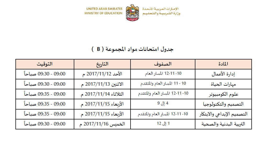 جميع الصفوف: جدول امتحان مواد المجموعة (ب) المنهاج الوزاري في الامارات الفصل الأول | ||
