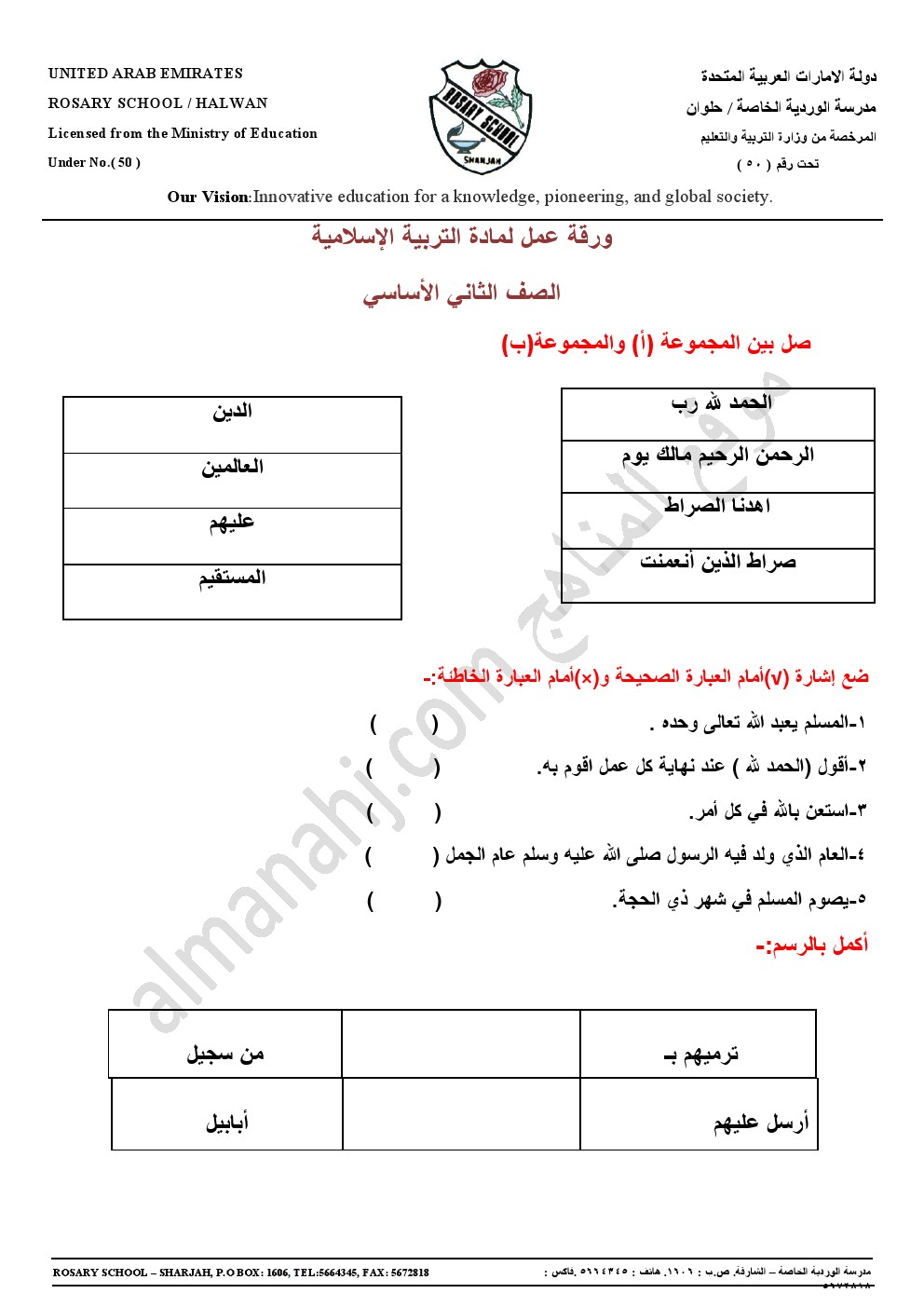 الصف الثاني, الفصل الأول, تربية اسلامية, 2017-2018, ورقة عمل نموذجية