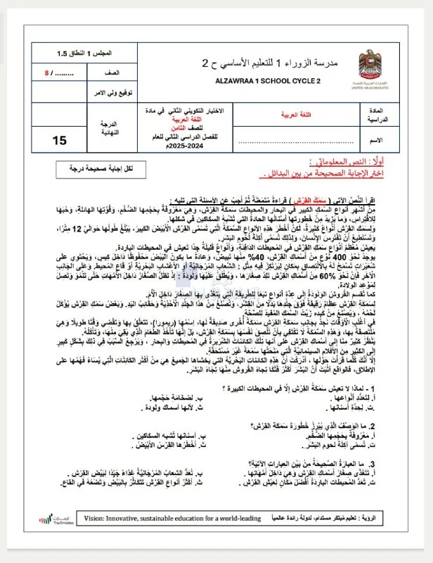 تم إيجاد الملف: أسئلة الاختبار التكويني الثاني نص سمك القرش