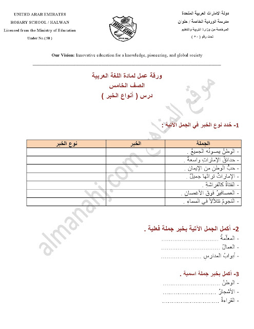 الصف الخامس, الفصل الأول, لغة عربية, 2017-2018, ورقة عمل درس أنواع الخبر