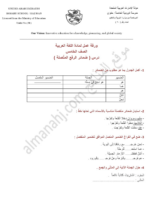 الصف الخامس, الفصل الأول, لغة عربية, 2017-2018, ورقة عمل - ضمائر الرفع المتصلة