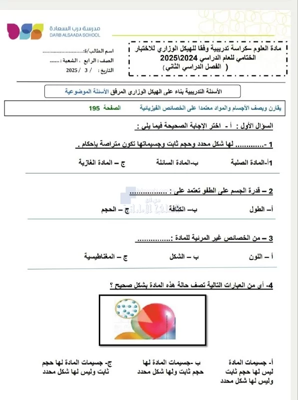 النموذج التدريبي للاختبار النهائي وفق الهيكل الوزاري - إعداد: مدرسة درب السعادة | ||