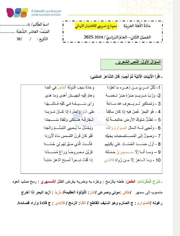 النموذج التدريبي للاختبار النهائي وفق الهيكل الوزاري - إعداد: مدرسة درب السعادة | ||