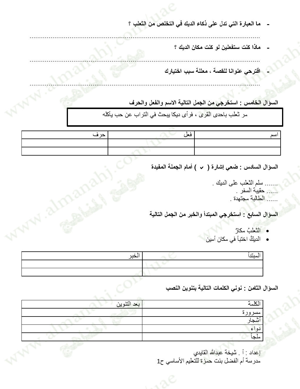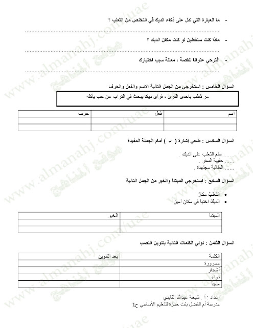 الصف الخامس, الفصل الأول, لغة عربية, 2017-2018, أوراق عمل تدريبية لامتحان نهاية الفصل الاول