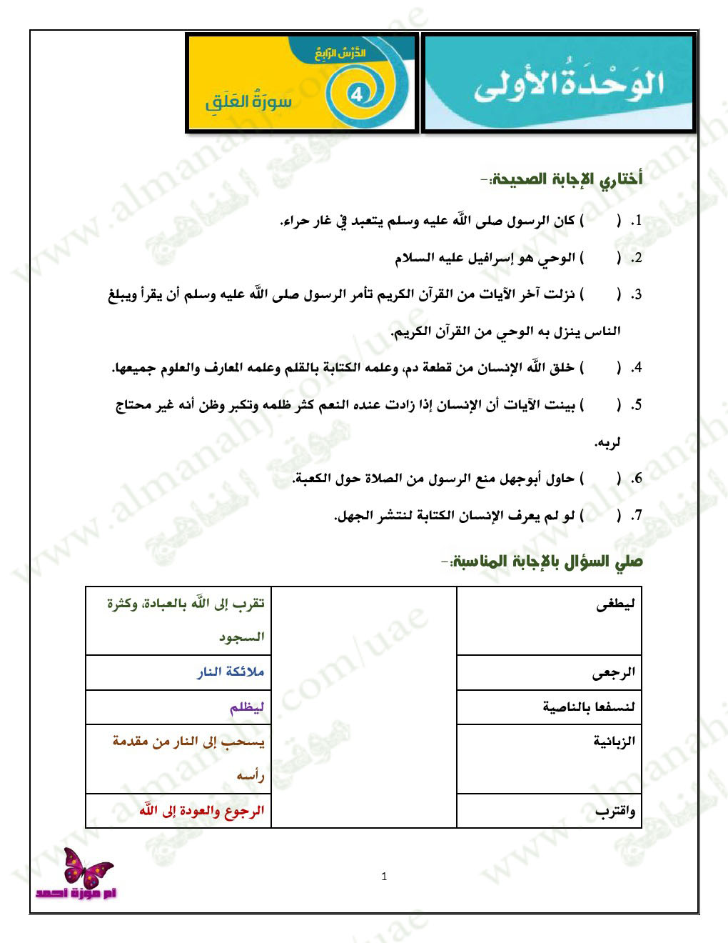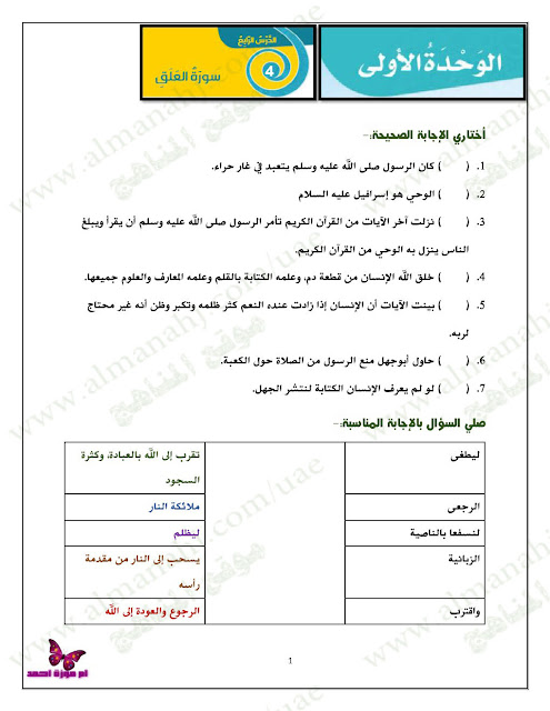 الصف الثالث, الفصل الأول, تربية اسلامية, 2017-2018, ورقة عمل درس سورة العلق