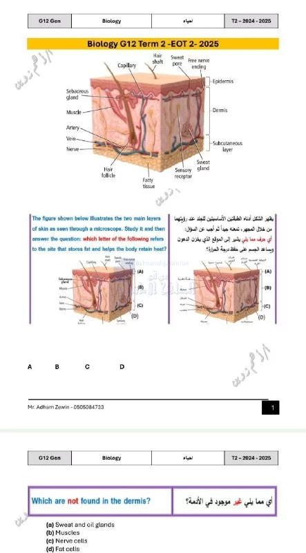 معلومات الملف: تتناول الورقة موضوعات متنوعة في علم الأحياء، بما في ذلك تركيب الجلد ووظائفه، وأنواع العضلات، والجهاز المناعي، والأمراض المعدية وغير المعدية. تشمل الأسئلة تحليلًا لطبقات الجلد، ووظائف الخلايا العضلية، واستجابات الجهاز المناعي الأولية والثانوية، بالإضافة إلى تصنيف الأمراض بناءً على أسبابها وأمثلتها. | ||