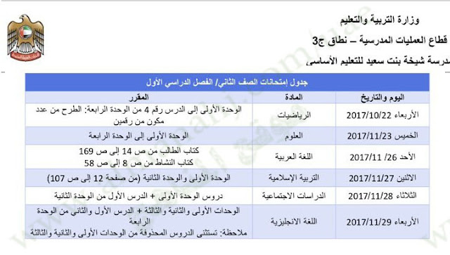 الصف الثاني: مقررات مواد امتحان نهاية الفصل الاول 2017-2018