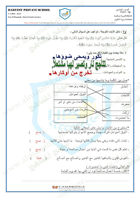 معلومات الملف: الصف الخامس, الفصل الأول, تربية اسلامية, 2017-2018, تدريبات سورة التكوير | |||