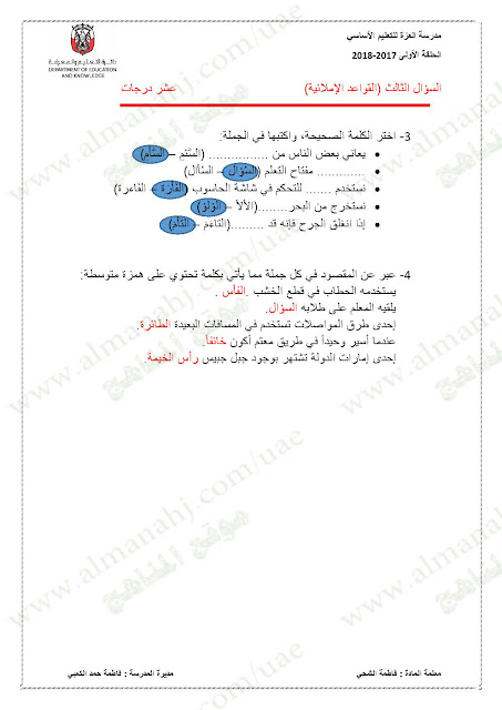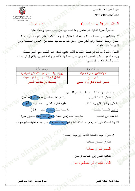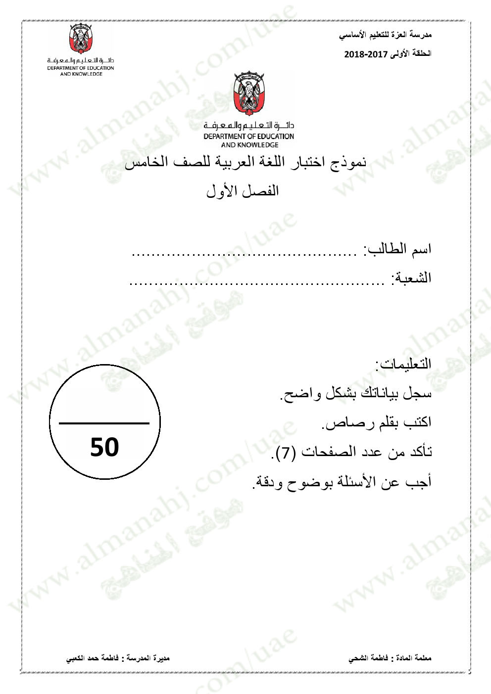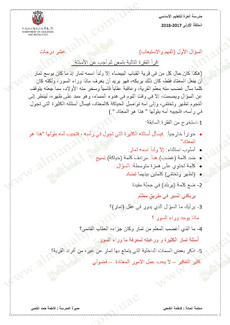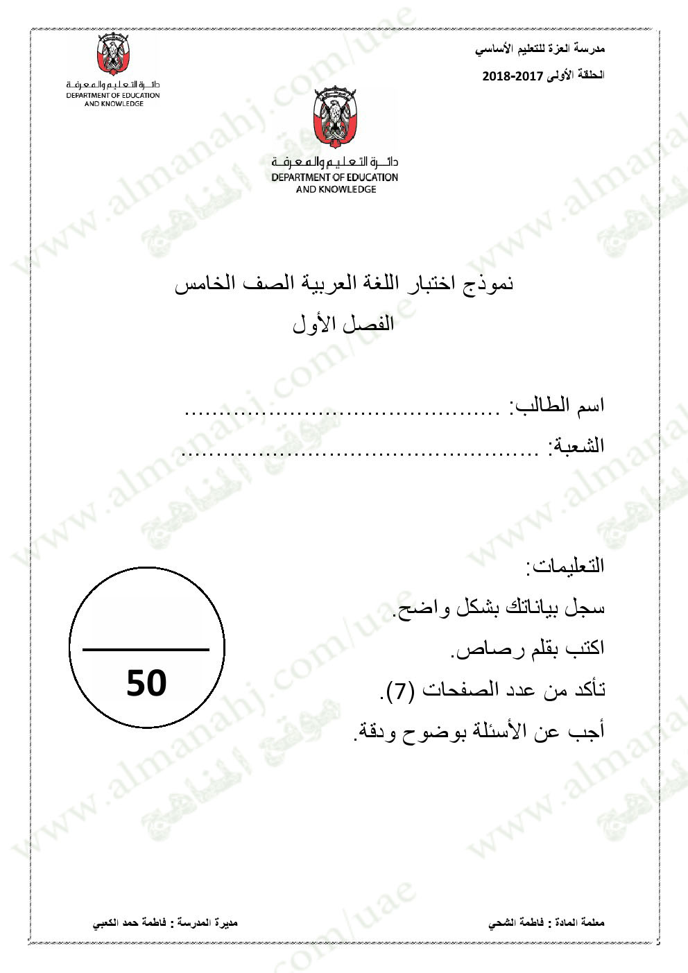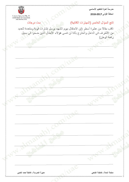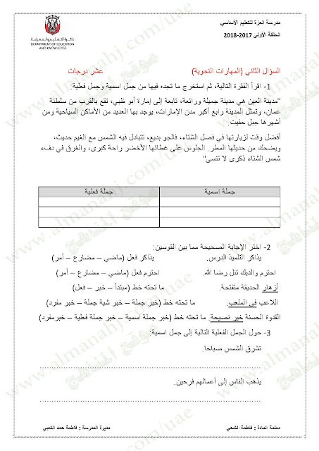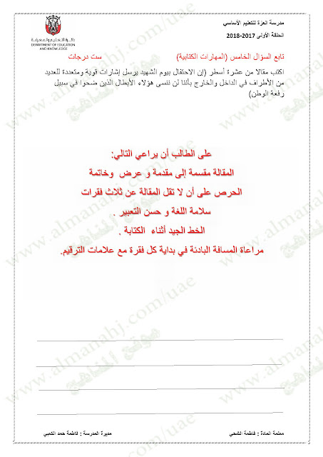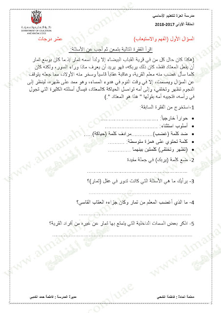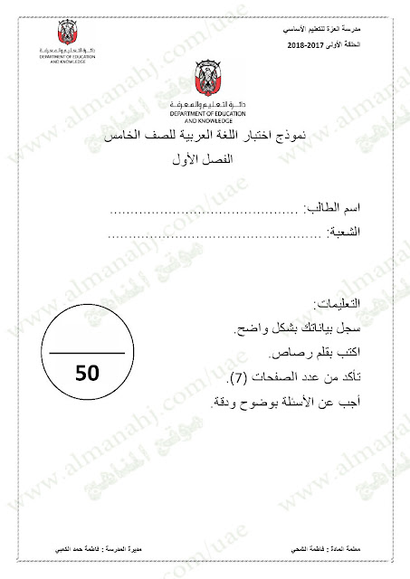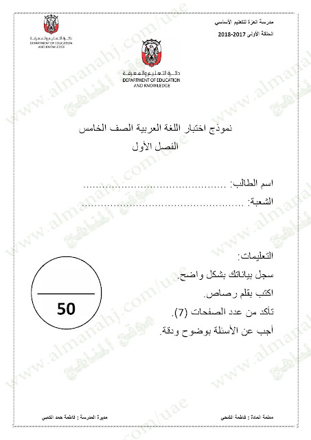 معلومات الملف: الصف الخامس, الفصل الأول, لغة عربية, 2017-2018,نموذجاختبار لغة عربية لامتحان نهاية الفصل الاول | |||