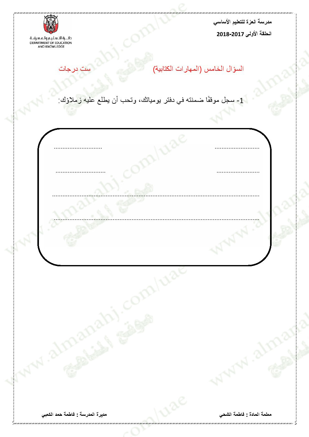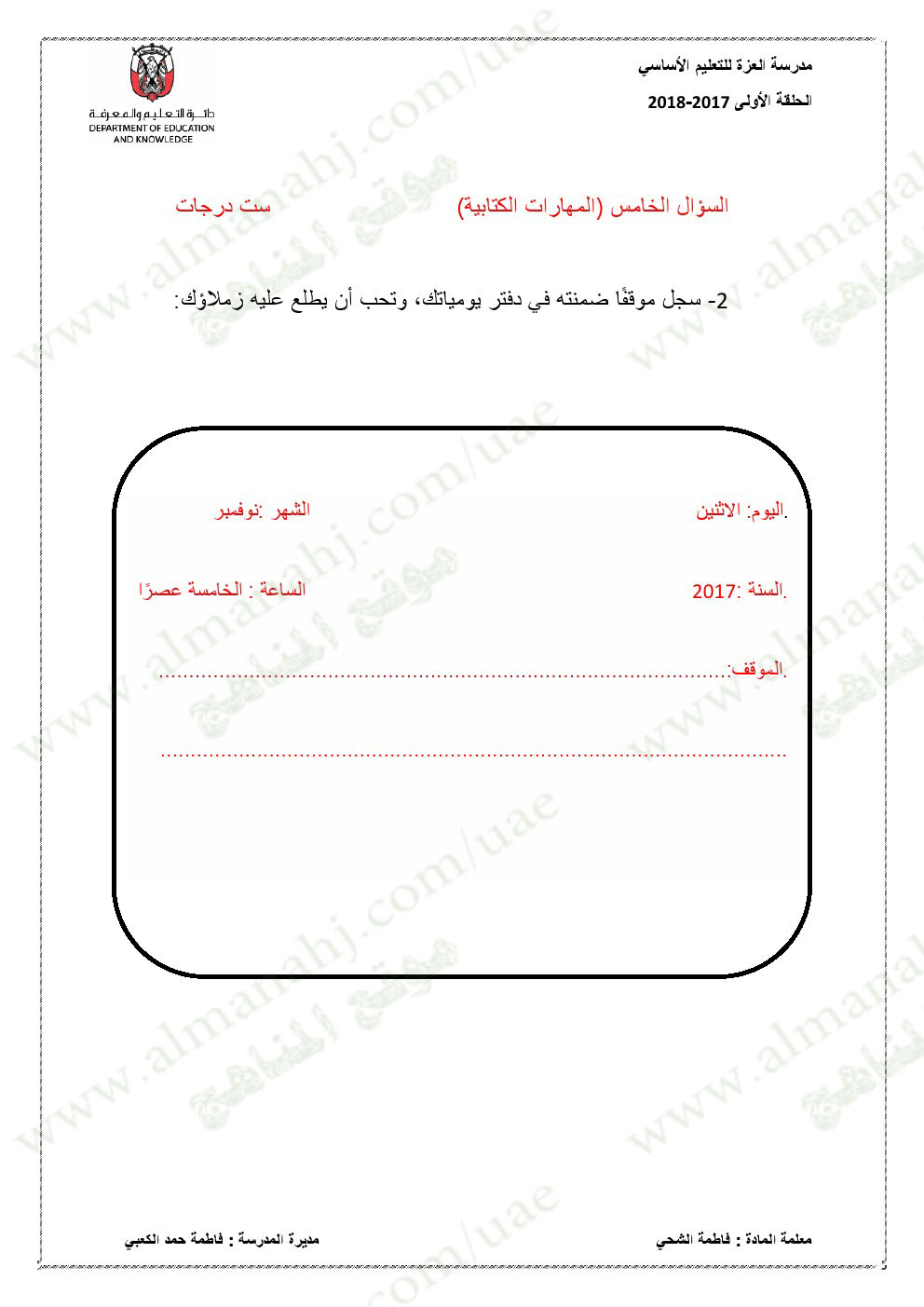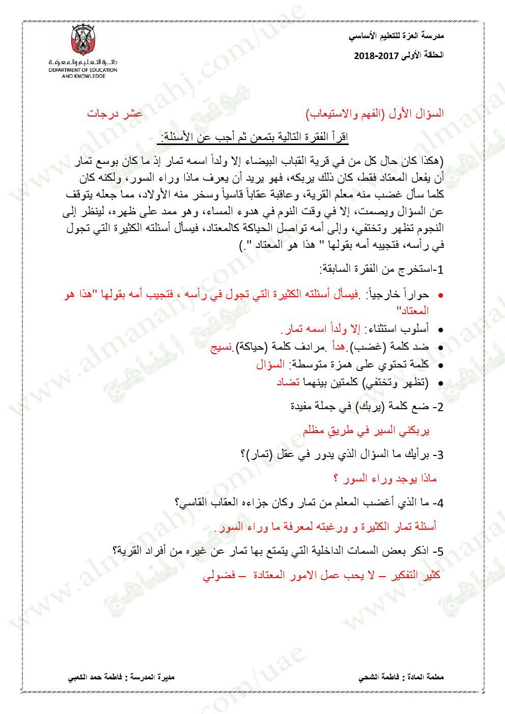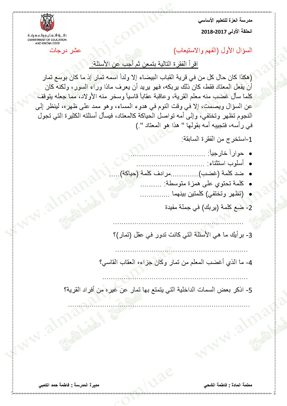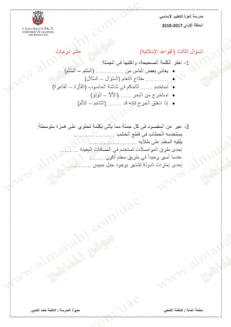 معلومات الملف: الصف الخامس, الفصل الأول, لغة عربية, 2017-2018,نموذجاختبار لغة عربية لامتحان نهاية الفصل الاول | |||