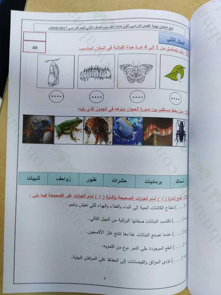الصف الثاني, الفصل الأول, علوم, 2017-2018, اسئلة الامتحان الوزاري الرسمي لنهاية الفصل الاول