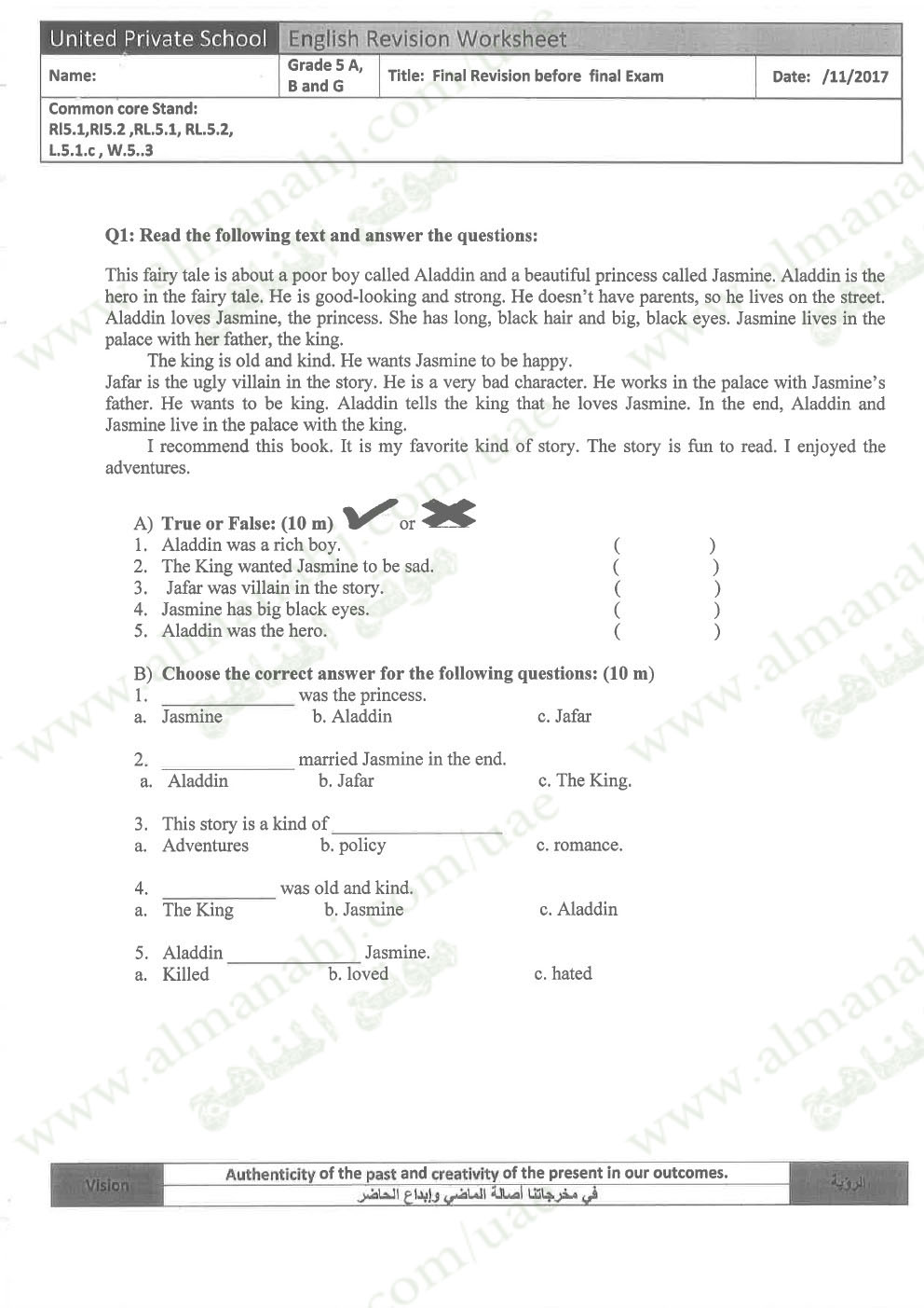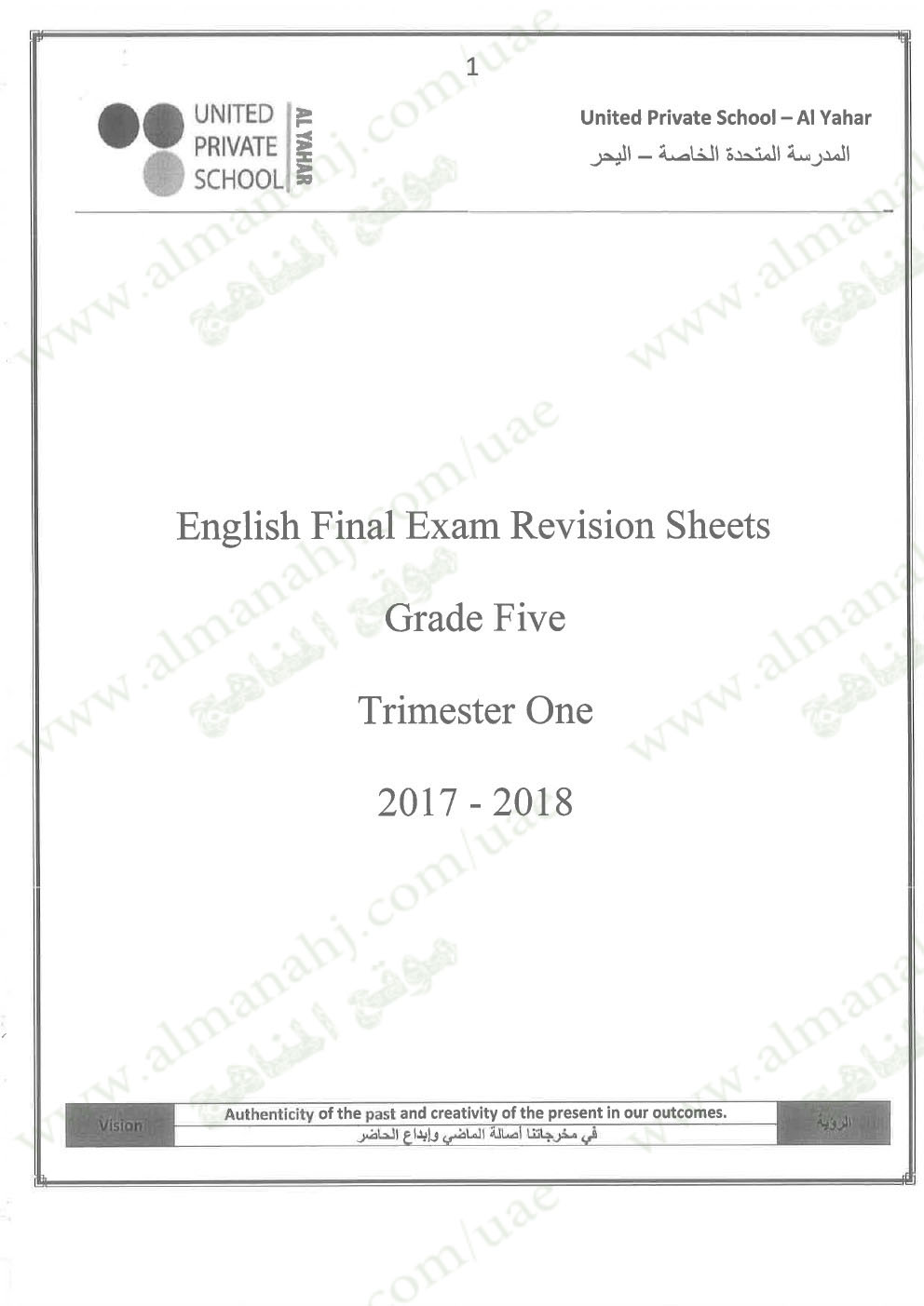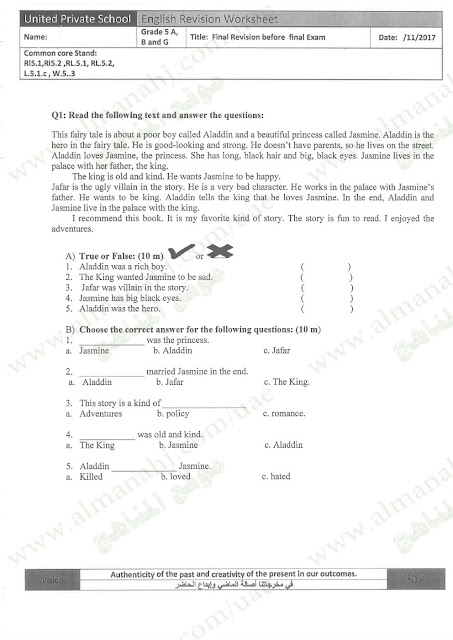 معلومات الملف: الصف الخامس, الفصل الأول, لغة انكليزية, 2017-2018,نموذجتدريبي لامتحان نهاية الفصل الأول | |||
