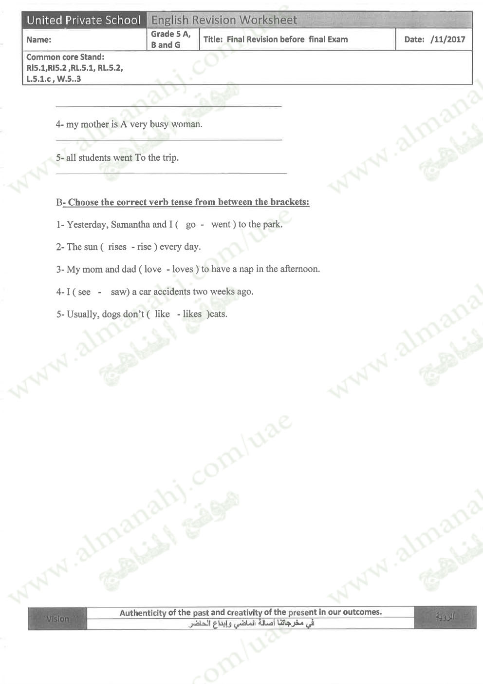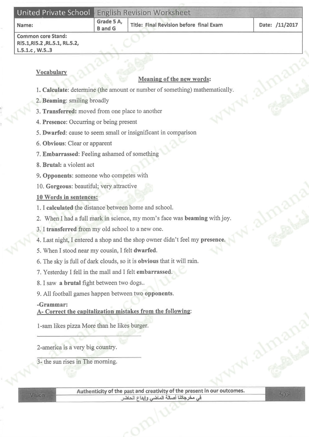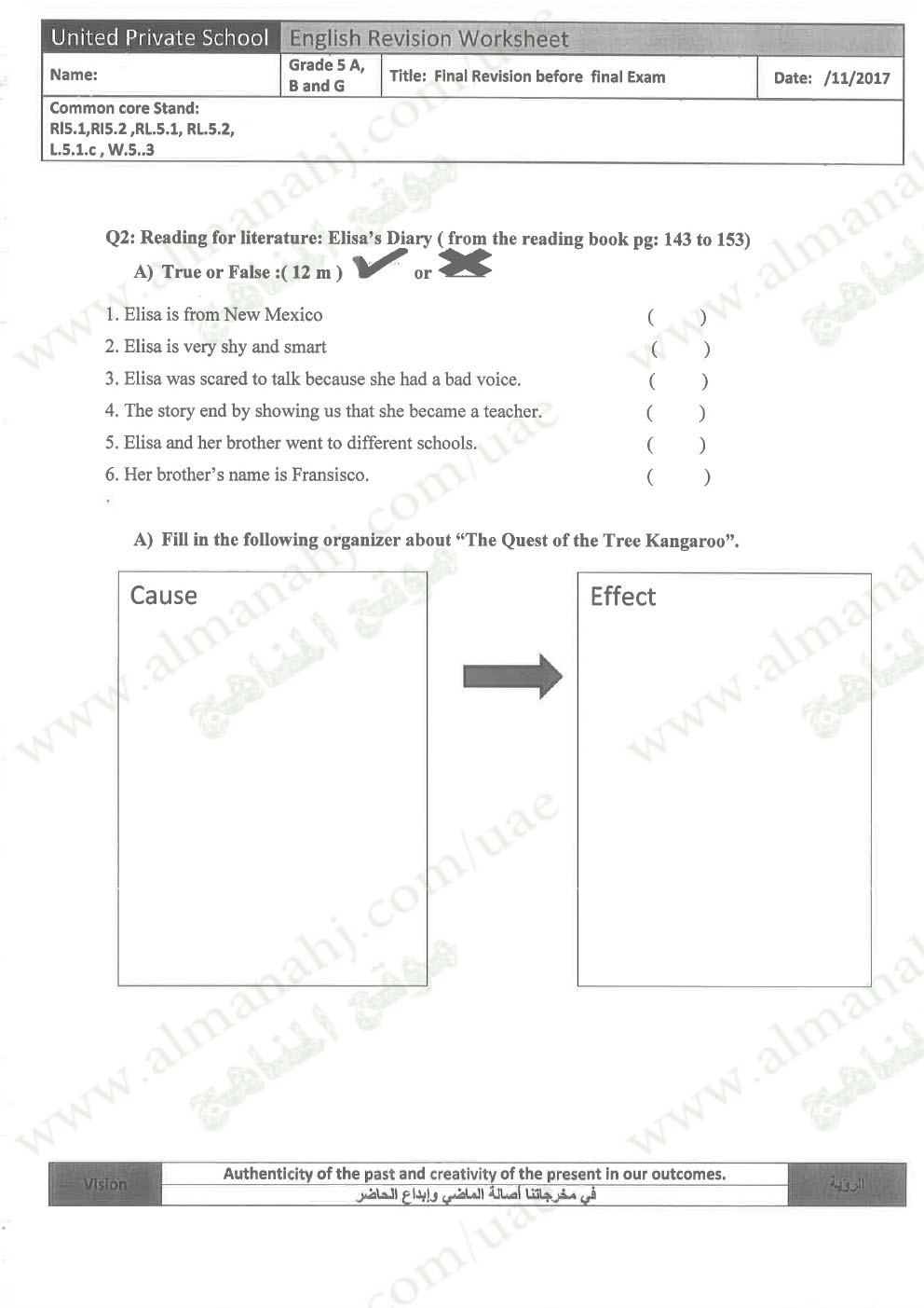 معلومات الملف: الصف الخامس, الفصل الأول, لغة انكليزية, 2017-2018,نموذجتدريبي لامتحان نهاية الفصل الأول | |||