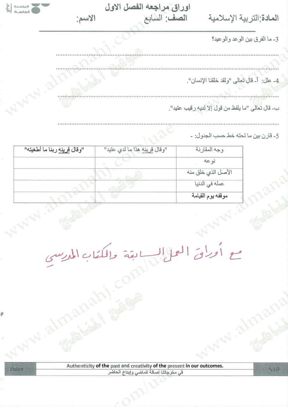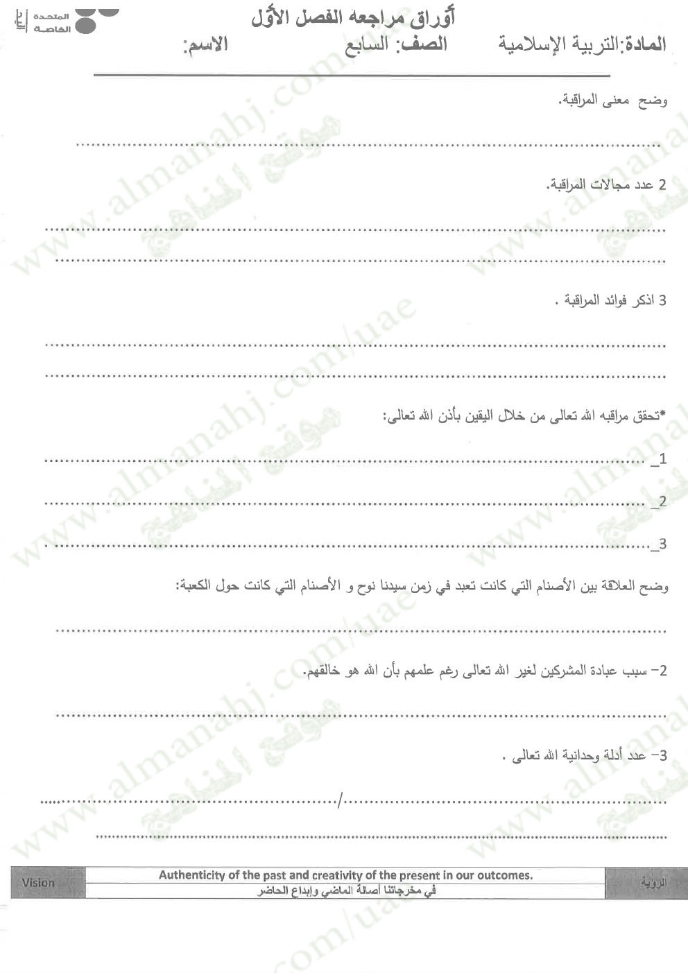 معلومات الملف: الصف السابع, الفصل الأول, تربية اسلامية, 2017-2018, مراجعة نهائية مع الحل | |||