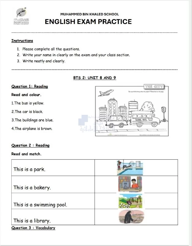| أوراق عمل ENGLISH EXAM PRACTICE مراجعة امتحانية - إعداد: مدرسة محمد بن خالد | ||