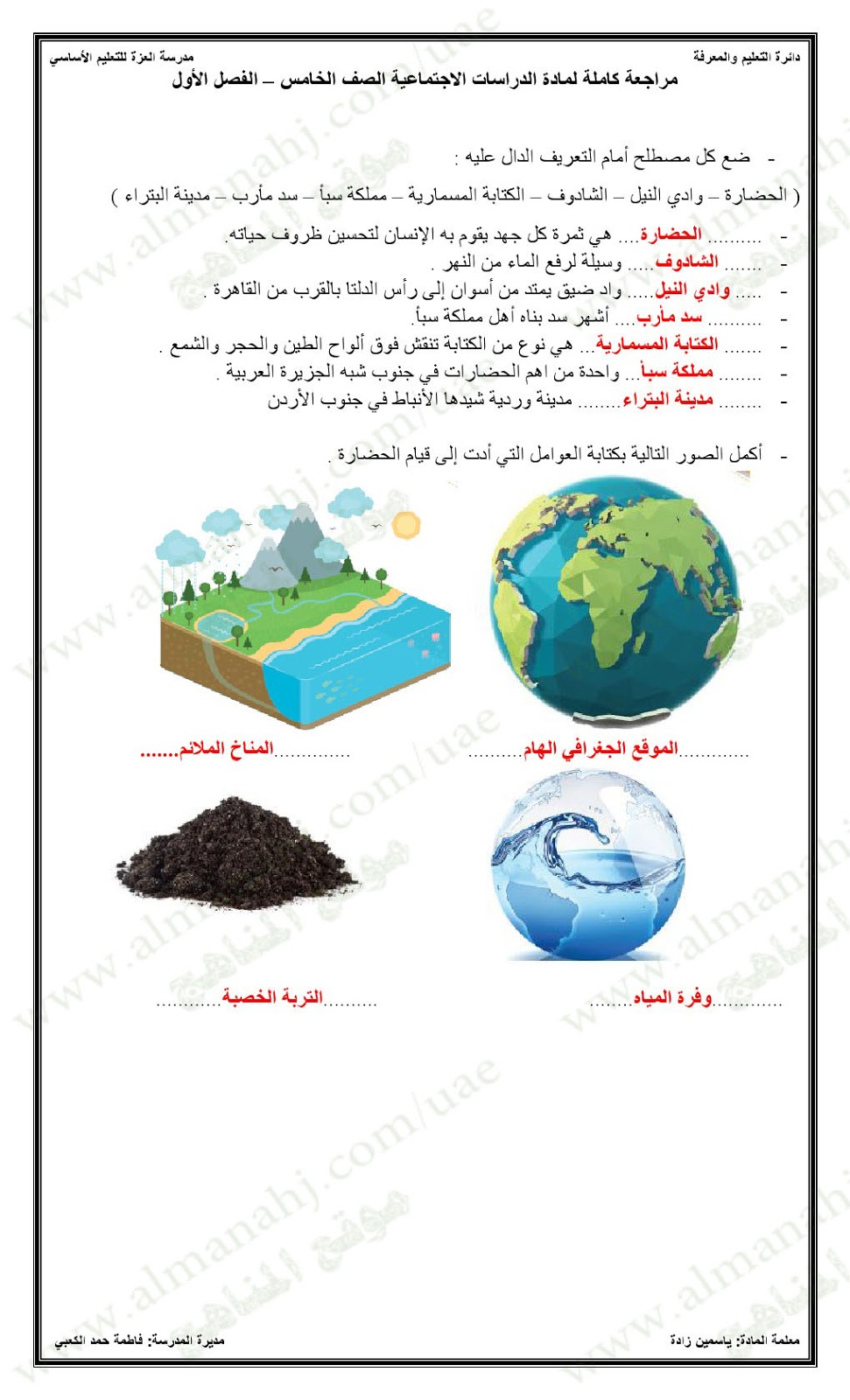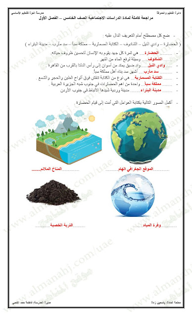 معلومات الملف: الصف الخامس, الفصل الأول, اجتماعيات, 2017-2018, مراجعة شاملة تحضيراً لامتحان نهاية الفصل الاول | |||