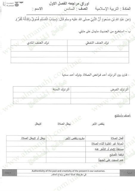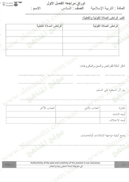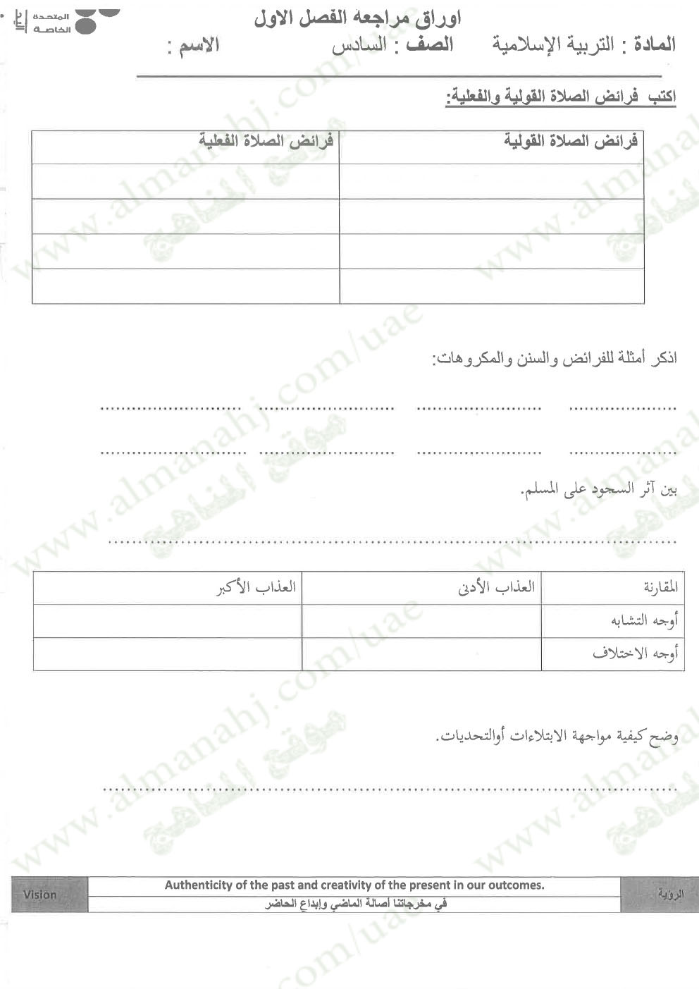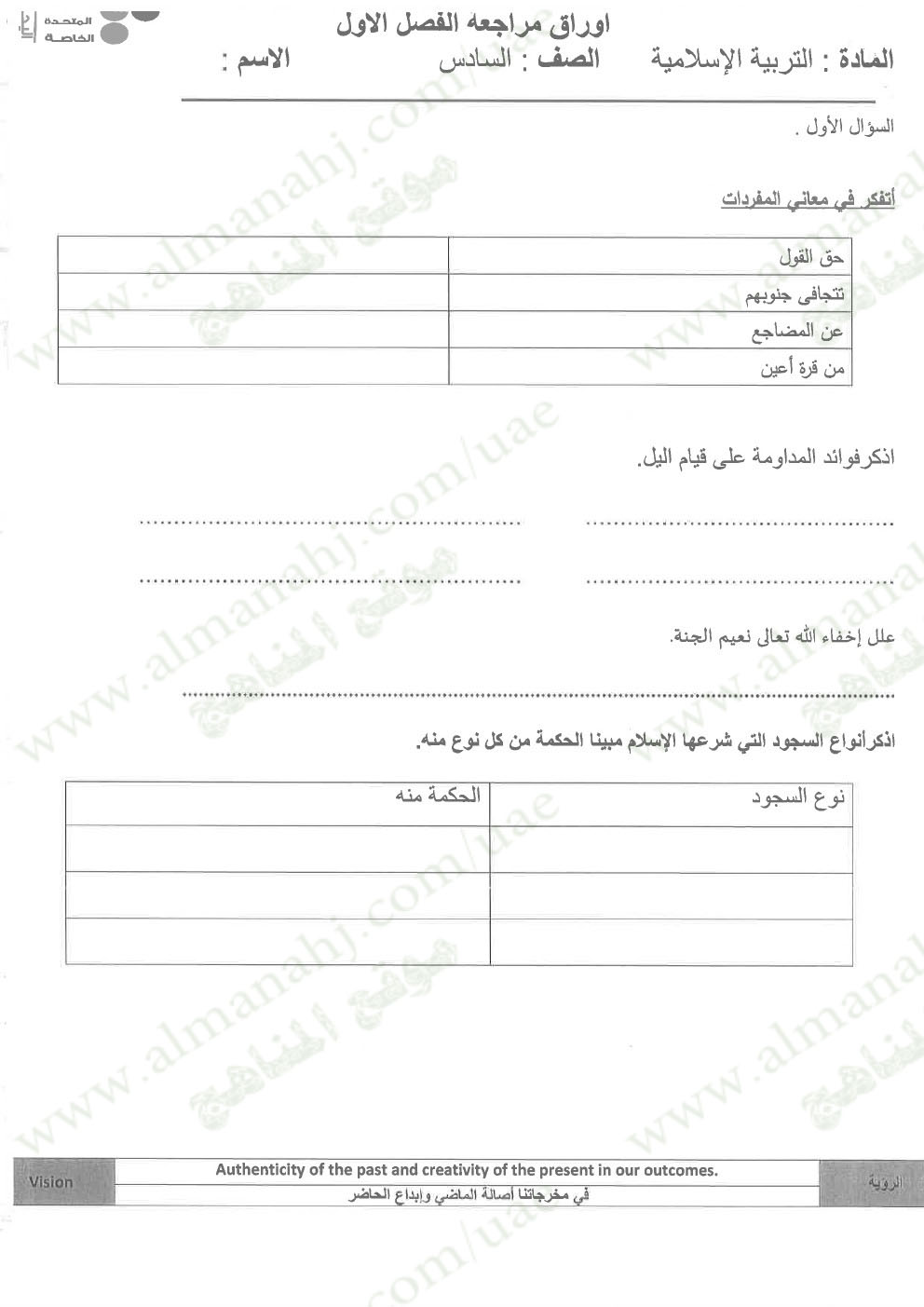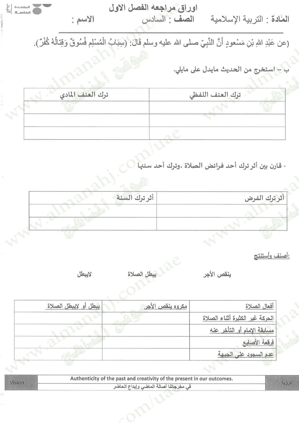 معلومات الملف: الصف السادس, الفصل الأول, تربية اسلامية, 2017-2018, مراجعة شاملة تحضيراً لامتحان نهاية الفصل الاول مع الحل | |||